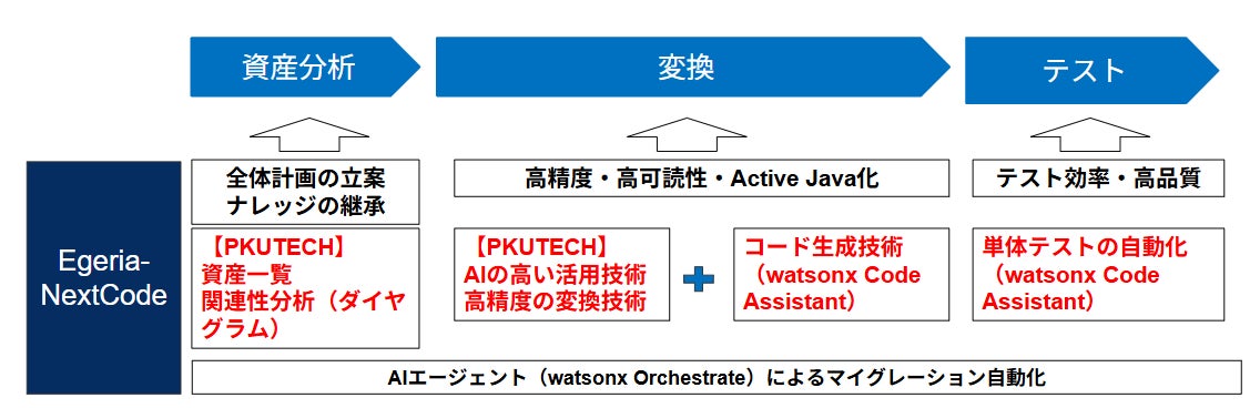 PKUTECHは従来より、COBOLをはじめとする既存資産のマイグレーション事業に取り組んでおり、独自に開発した資産分析・可視化ツールや変換ツールを通じて、多様な移行ニーズに対応してきました。現在は、AI博士集団が開発を手掛ける自社AIソリューション「Egeriaシリーズ」の提供を行っています。一方、日本IBM社は、ビジネスのためのAIである「watsonx」シリーズの提供を通じ、IT変革やビジネス変革を含む全社的なデジタル変革を支援しています。今回、両社は相互の得意領域を活かし、マイグレーション分野での新たなソリューションの共同開発を行いました。