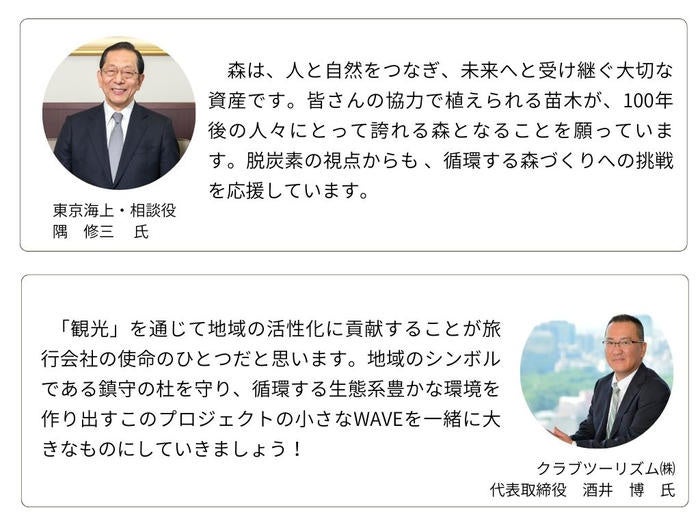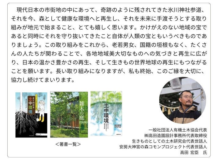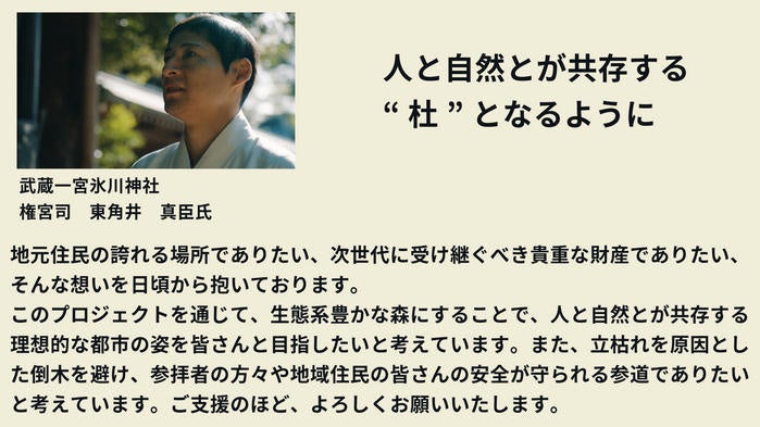「氷川参道は地元住民の誇りであり、次世代に受け継ぐべき貴重な財産です。生態系豊かな森に再生し、人と自然が共存する理想的な都市の姿を目指します。ぜひ、多くの方にご参加いただきたいと思います。」