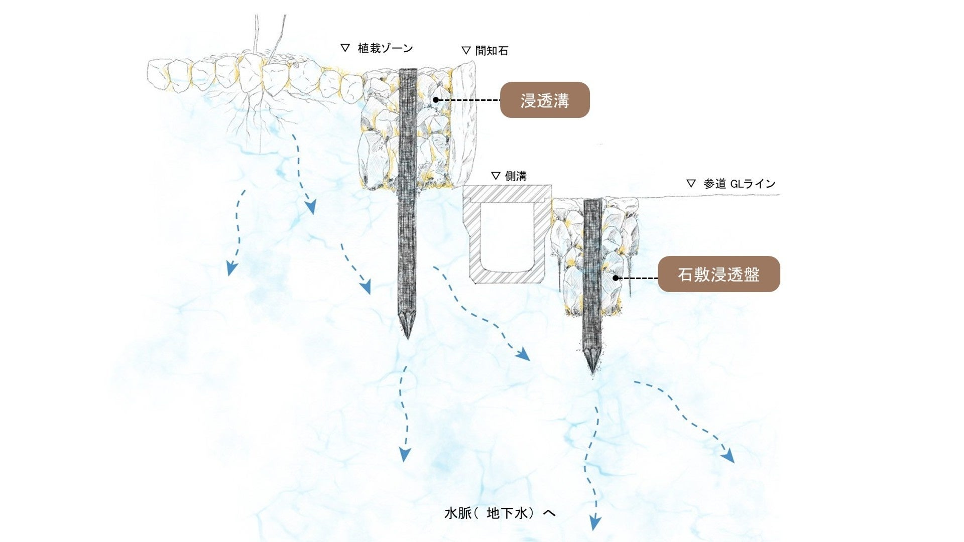 ■浸透溝・石敷浸透盤:雨水を地中へ導き、地下水脈と連動