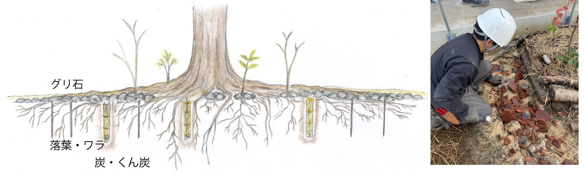 本プロジェクトは、土壌環境の改善を目指し、土中環境の専門家である高田造園設計事務所(高田宏臣氏)の指導のもと、長期的な環境再生を実現することを目指します。