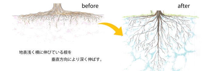 これらを通じて、透水性・通気性・保水性を高め、菌糸が張りめぐる豊かな土中環境を取り戻します。