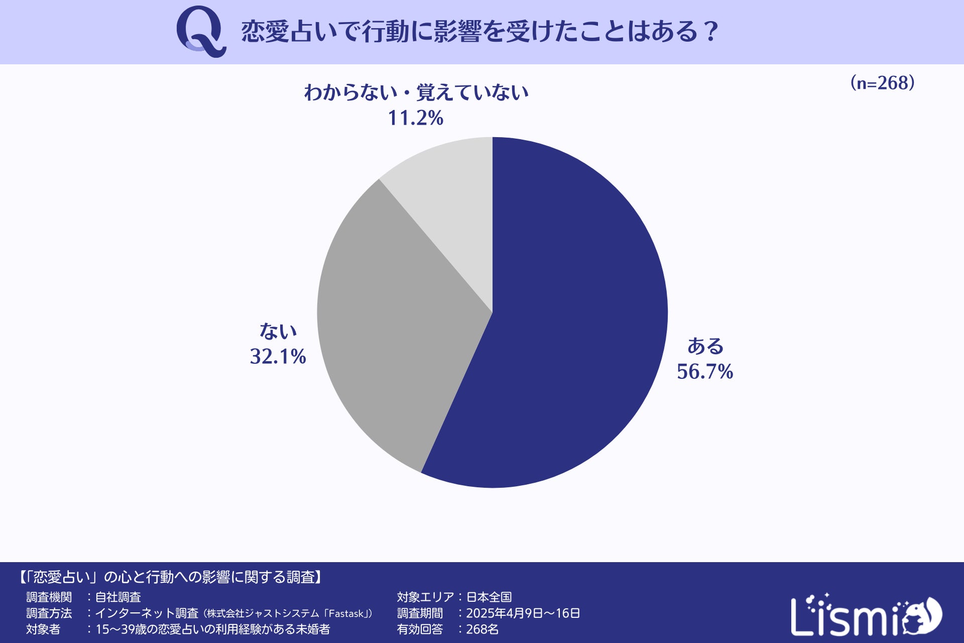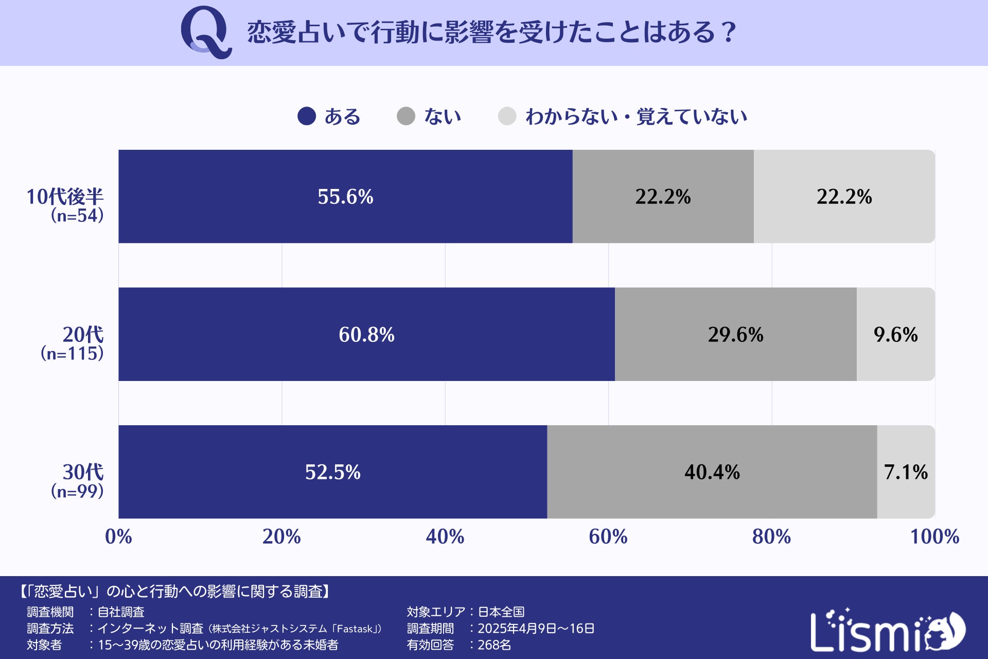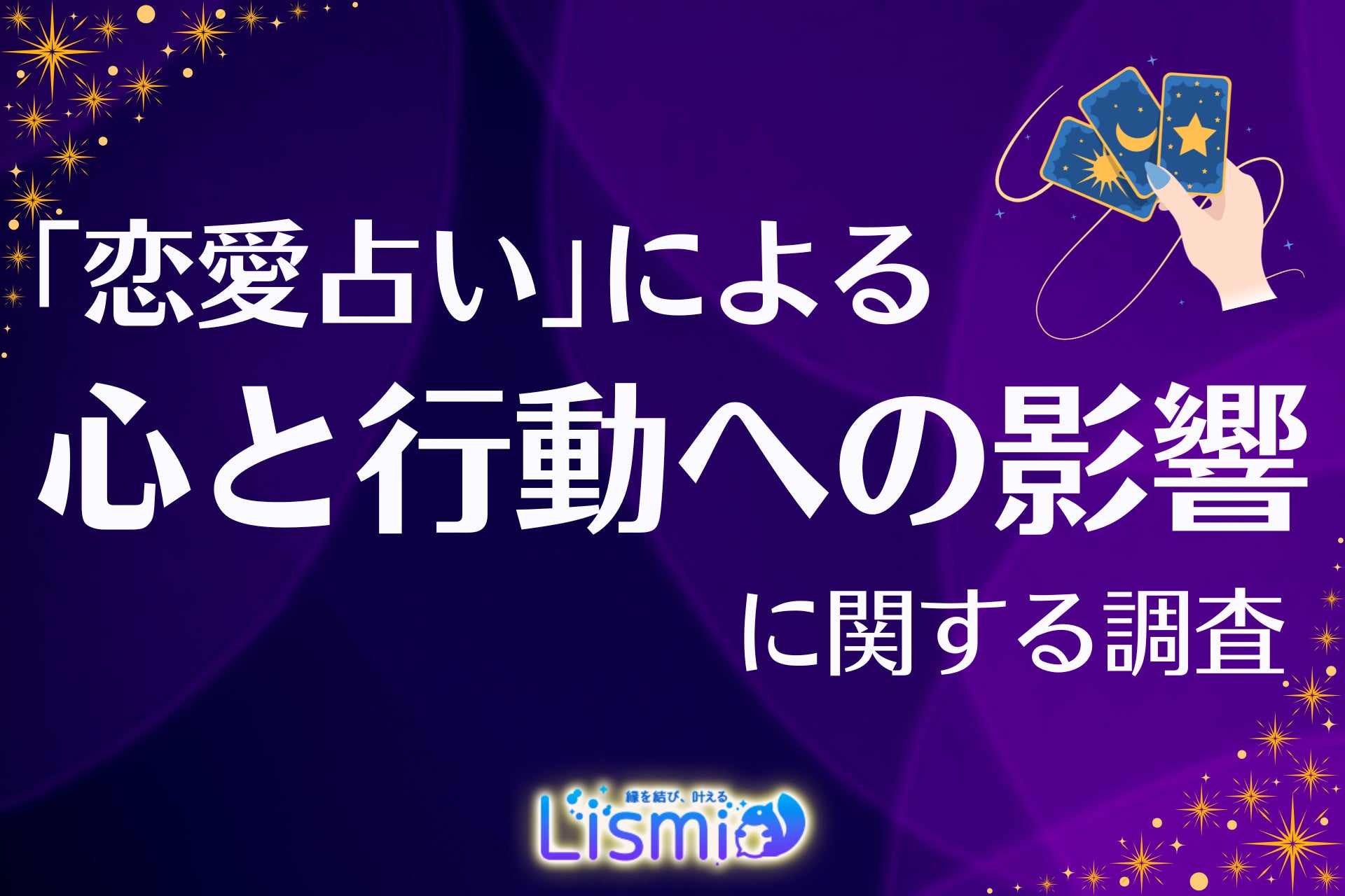 チャット占いアプリを提供する株式会社リスミィ( https://lismi.jp/ )(本社:大阪府大阪市、代表:池内康浩)は、恋愛占いが未婚男女の心理や行動に与える影響について調査するため、15~39歳の未婚男女268名を対象にアンケートを行いました。本調査では、恋愛占いが若い世代を中心に心理的な支えや行動のきっかけとなっており、結果に対して主体的に向き合う利用者が多いことが明らかになりました。