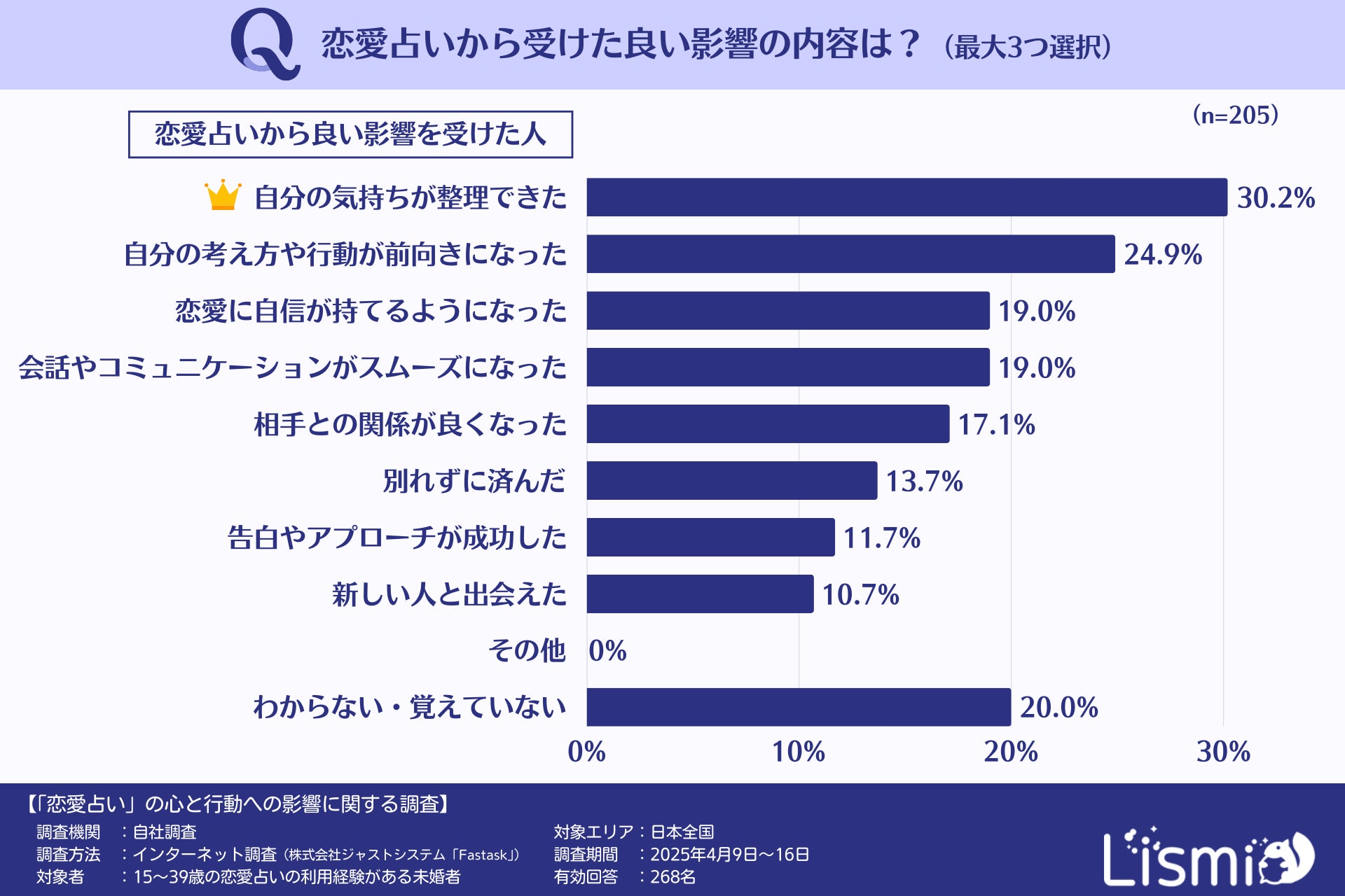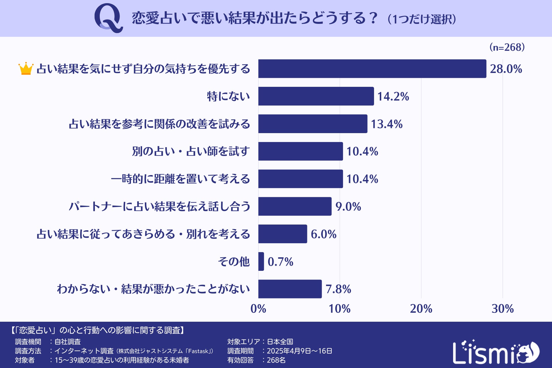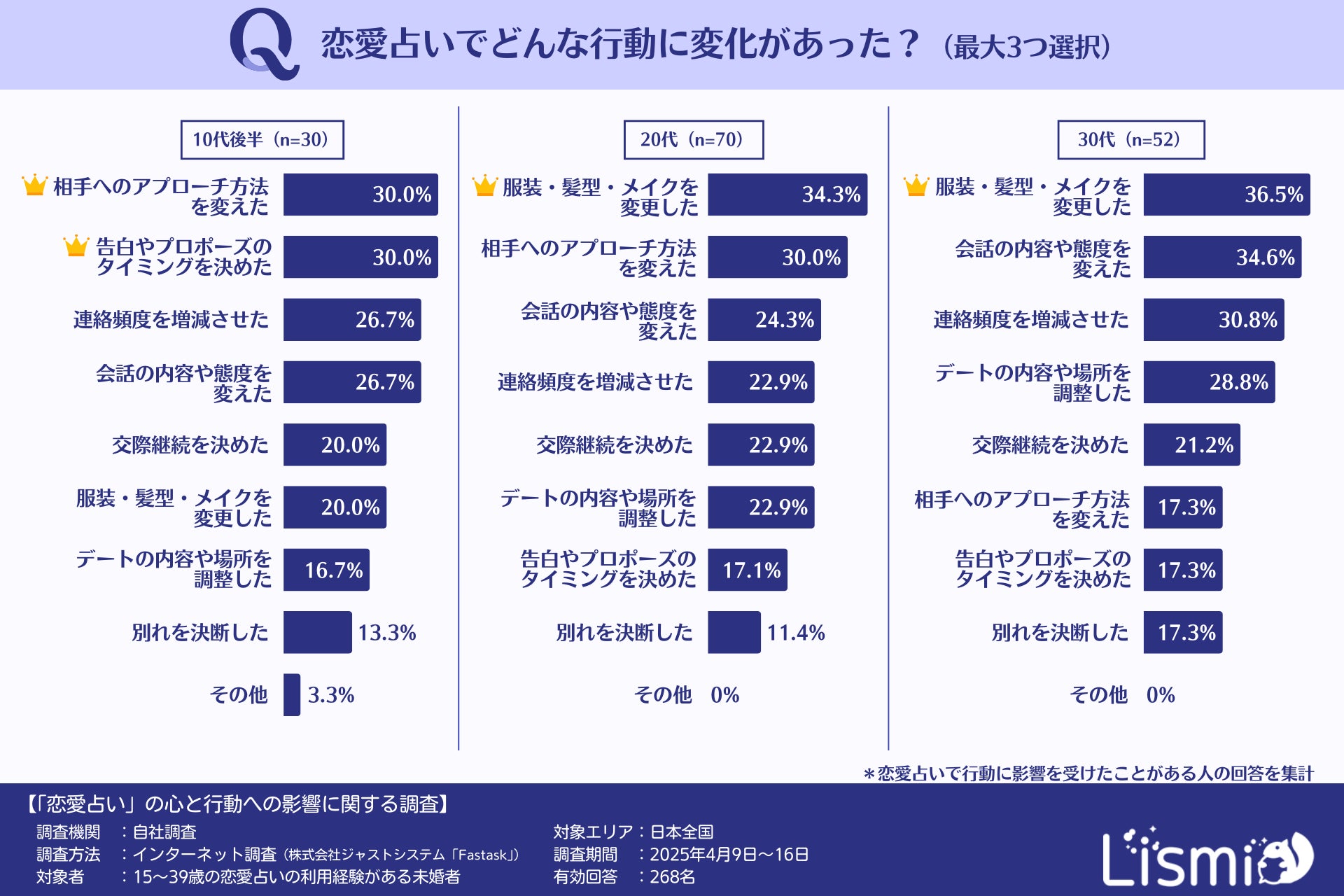 チャット占いアプリを提供する株式会社リスミィ( https://lismi.jp/ )(本社:大阪府大阪市、代表:池内康浩)は、恋愛占いが未婚男女の心理や行動に与える影響について調査するため、15~39歳の未婚男女268名を対象にアンケートを行いました。本調査では、恋愛占いが若い世代を中心に心理的な支えや行動のきっかけとなっており、結果に対して主体的に向き合う利用者が多いことが明らかになりました。