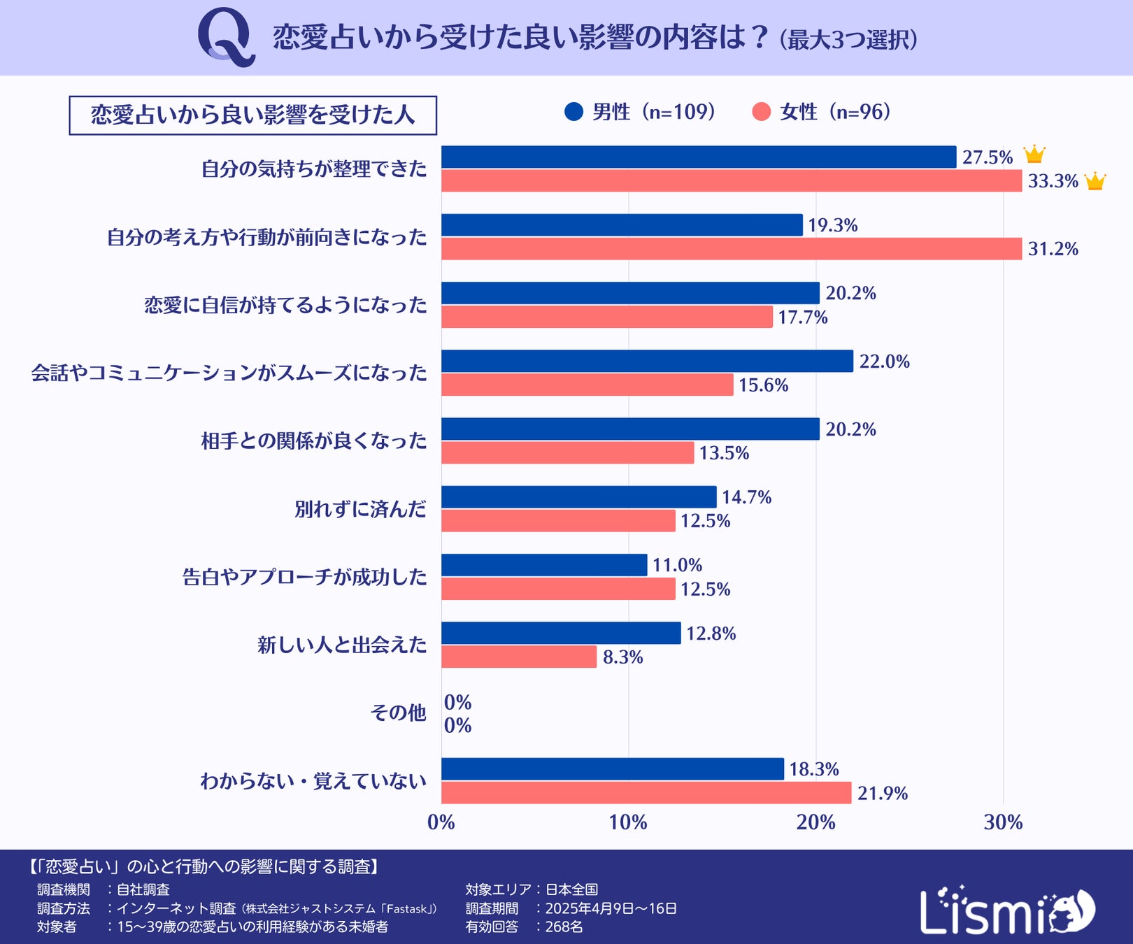 3.恋愛占いの良い影響に男女差、女性は「前向き」が多く31.2%、男性は「会話の円滑化」が多く22.0%