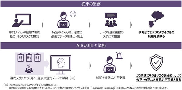 また、今回、モラルリスク検知の仕組みをすべて内製化することで、実装後も支払部門の専門スタッフの意見を反映し、機動的に性能改善や向上が可能となるほか、モラルリスクに関する情報を組織横断で共有することで、商品開発、お申込み時・お支払時などのあらゆる局面において、モラルリスクへの的確な対応が可能となります。