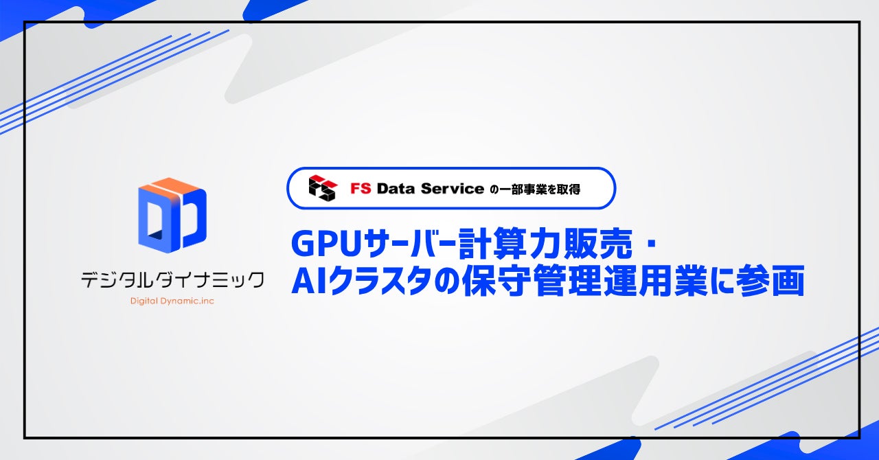 デジタルダイナミック株式会社(本社:東京都港区、代表取締役:根来 実、以下「当社」)は、FSデーターサービス株式会社(本社:東京都渋谷区、代表取締役:大島 崇)より、2025年7月1日にGPUサーバー計算力販売・GPUサーバーの保守管理運用事業を取得します。本事業譲受により、当社は事業開発から販売、保守管理までを一気通貫で提供できる体制を確立し、お客様への提供価値を一層向上させてまいります。