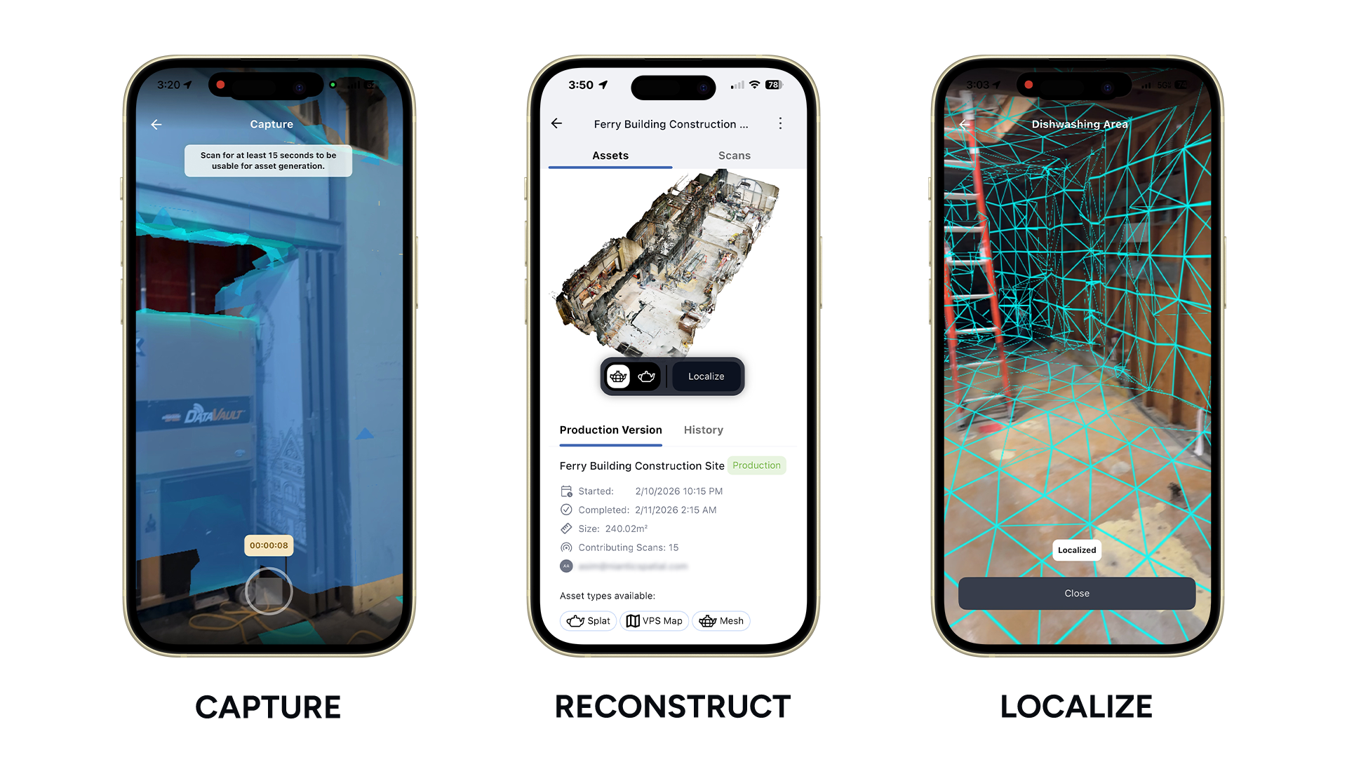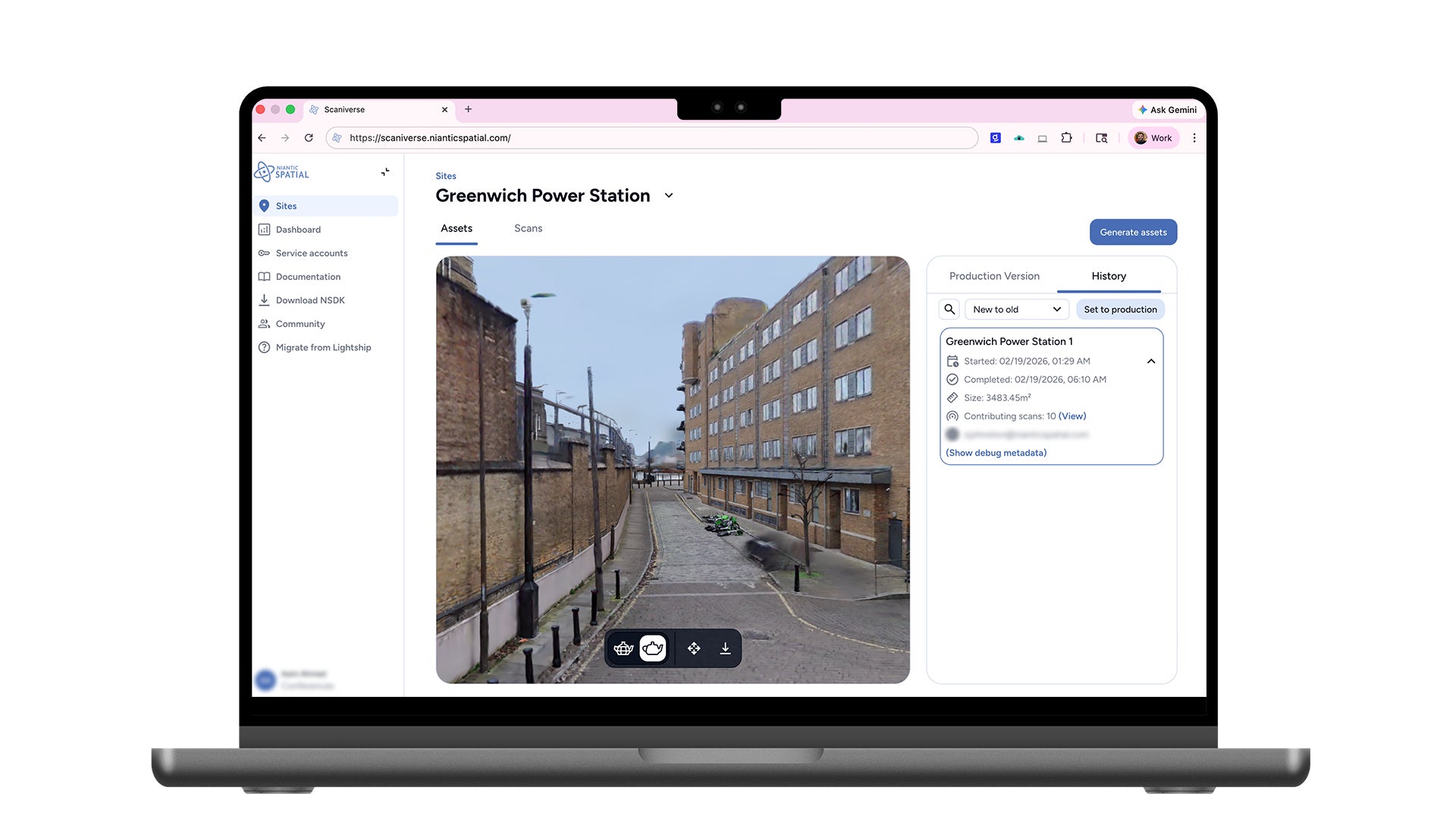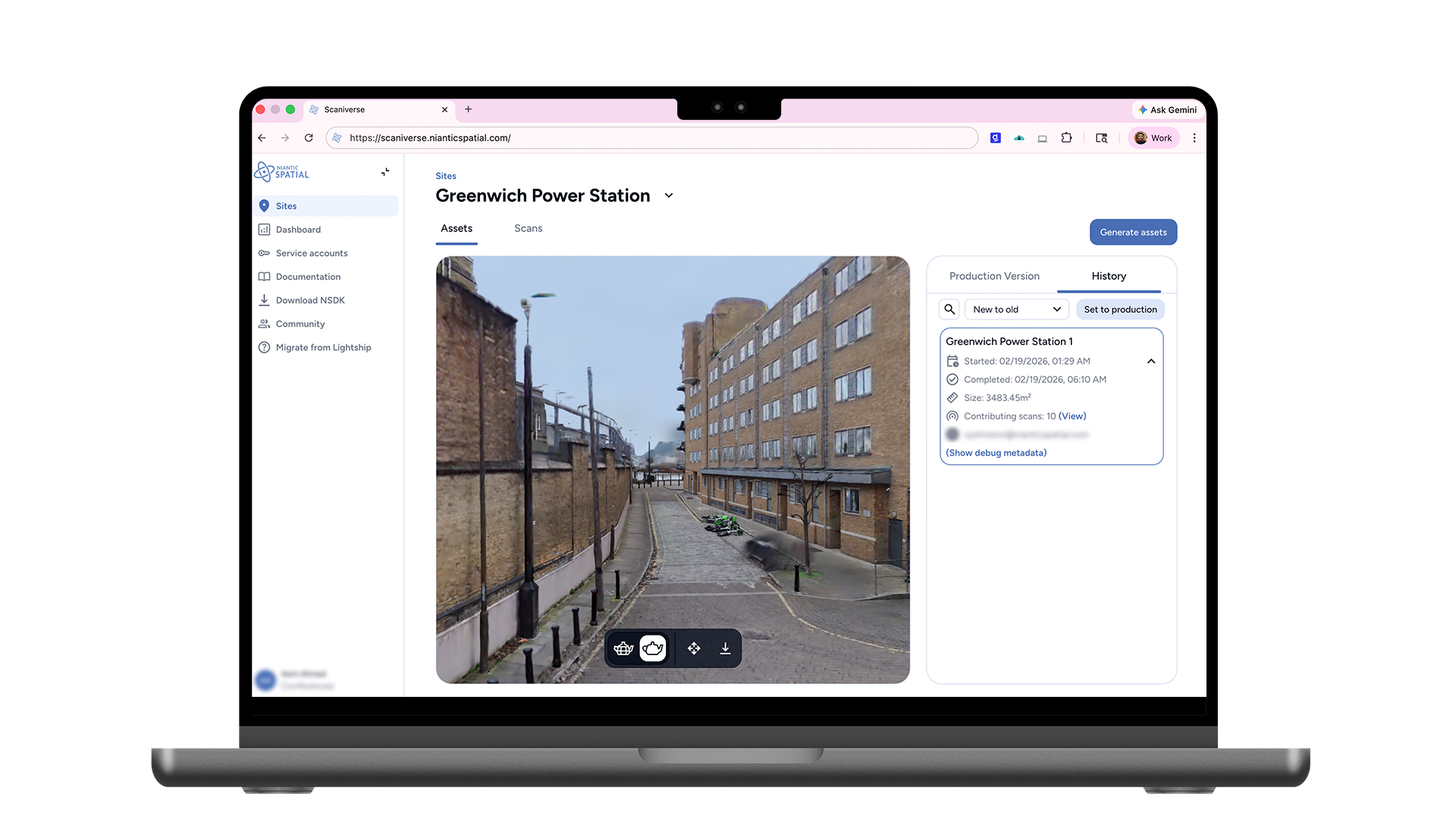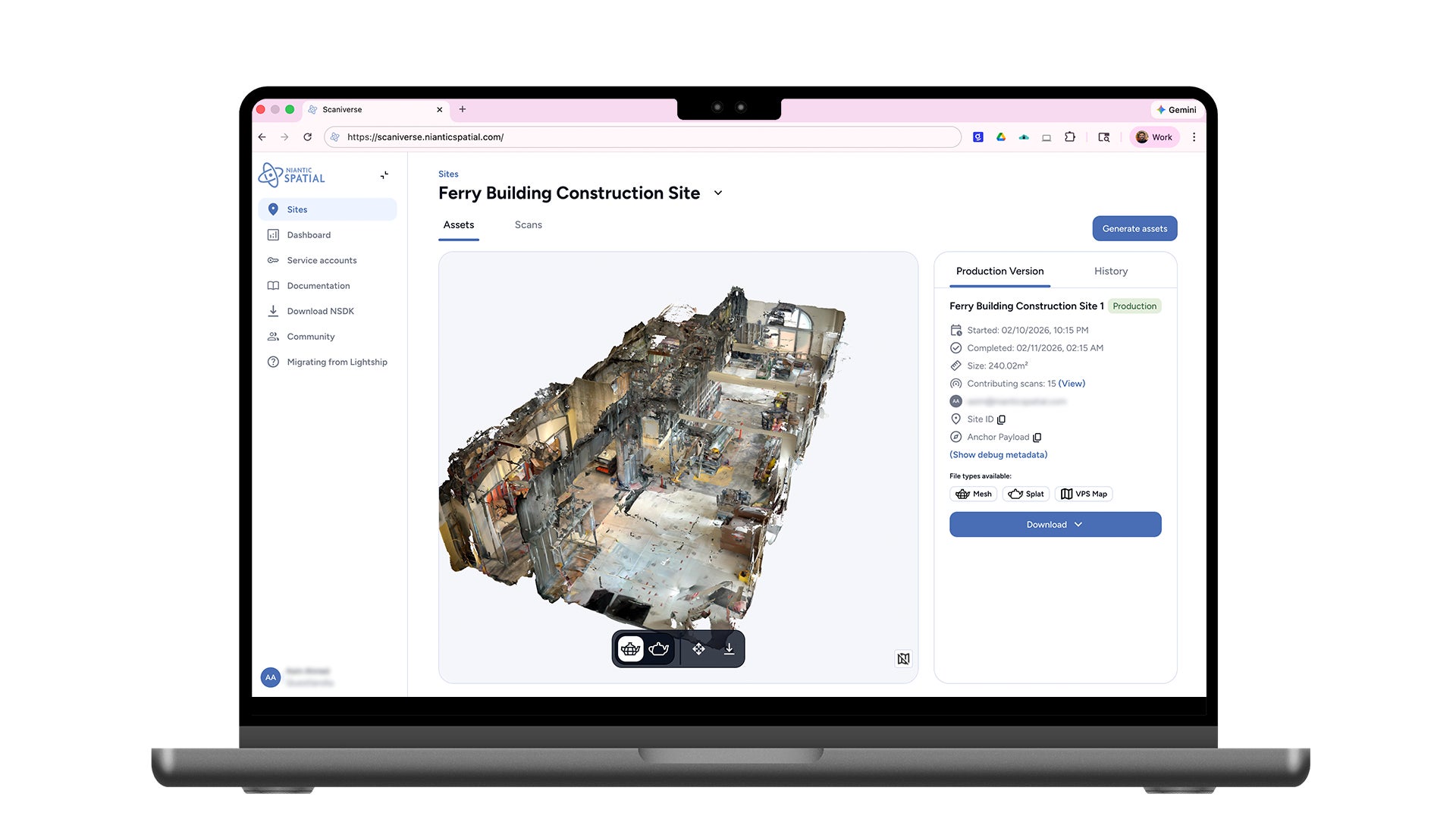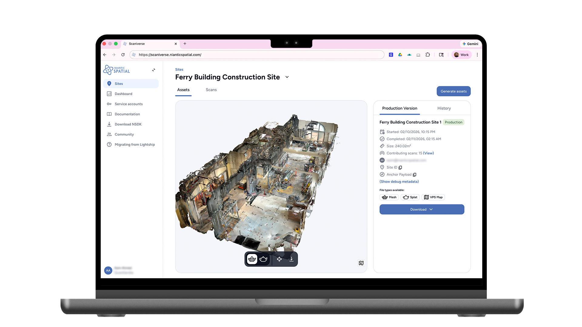 Scaniverse ビュアーでアセット処理とレビュー: メッシュ・スプラット・ロケーションマップを生成して、Niantic Spatial VPS を通してプレビュー。360°カメラからのデータの VPS 対応も近日公開予定です。