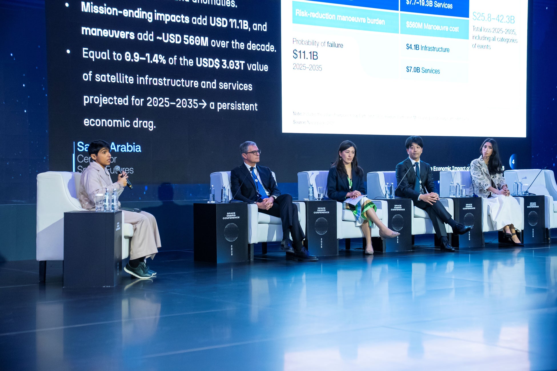 同パネルでは、世界経済フォーラム(WEF)と宇宙未来センターが公表した報告書が参照され、宇宙産業の拡大に伴う衝突リスクの高まりや、将来的な経済損失の深刻さが共有されました。同報告書によれば、2032年までに大規模な衝突が最大29%の確率で生じ、10cm以下の超小型宇宙デブリの衝突によるサービス障害や回避行動が積み重なり、2025–2035年の経済損失は2.58〜4.23兆ドル(日本円で約387兆〜635兆円)規模にのぼると試算されています。