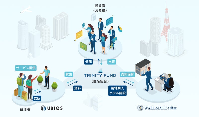 トリニティファンドを運営する株式会社WALLMATE不動産が本物件を取得し、グループ会社である株式会社UBIQS(以下、UBIQS)が旅館業の許可を取得(取得予定)、無人ホテルとして運営予定となります。※竣工直後は民泊として運営する場合があります。