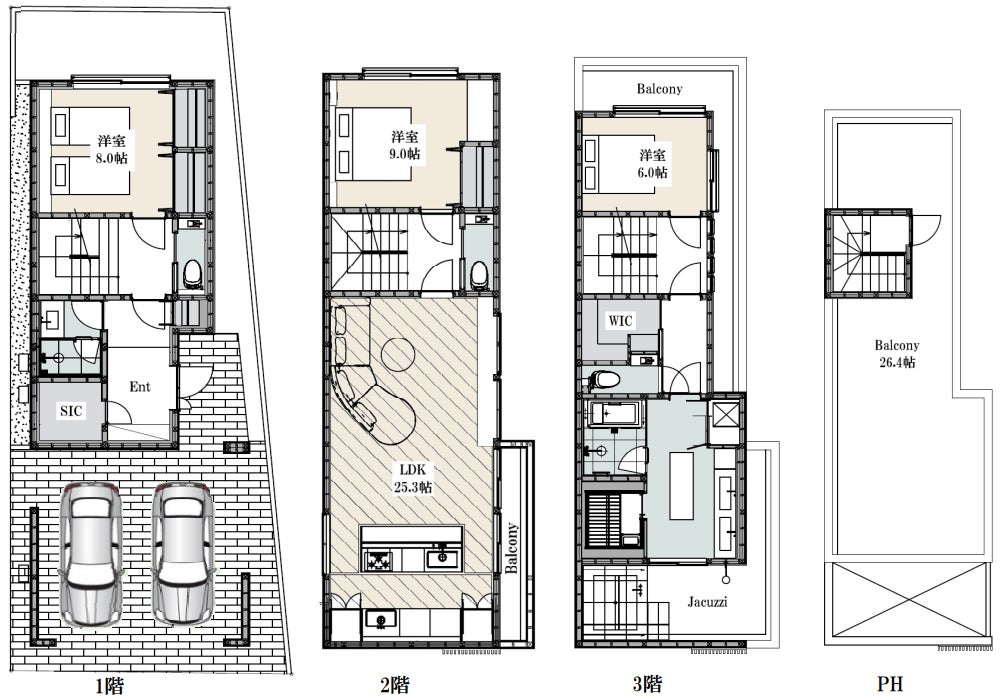 また、一般的な戸建にプレミアム感を付加した施工を実施し「上質さと非日常空間」を体感していただける設計とし、プライベートを重視した少人数や複数の家族での利用も想定してパーキングスペースは2台駐車可能となっております。