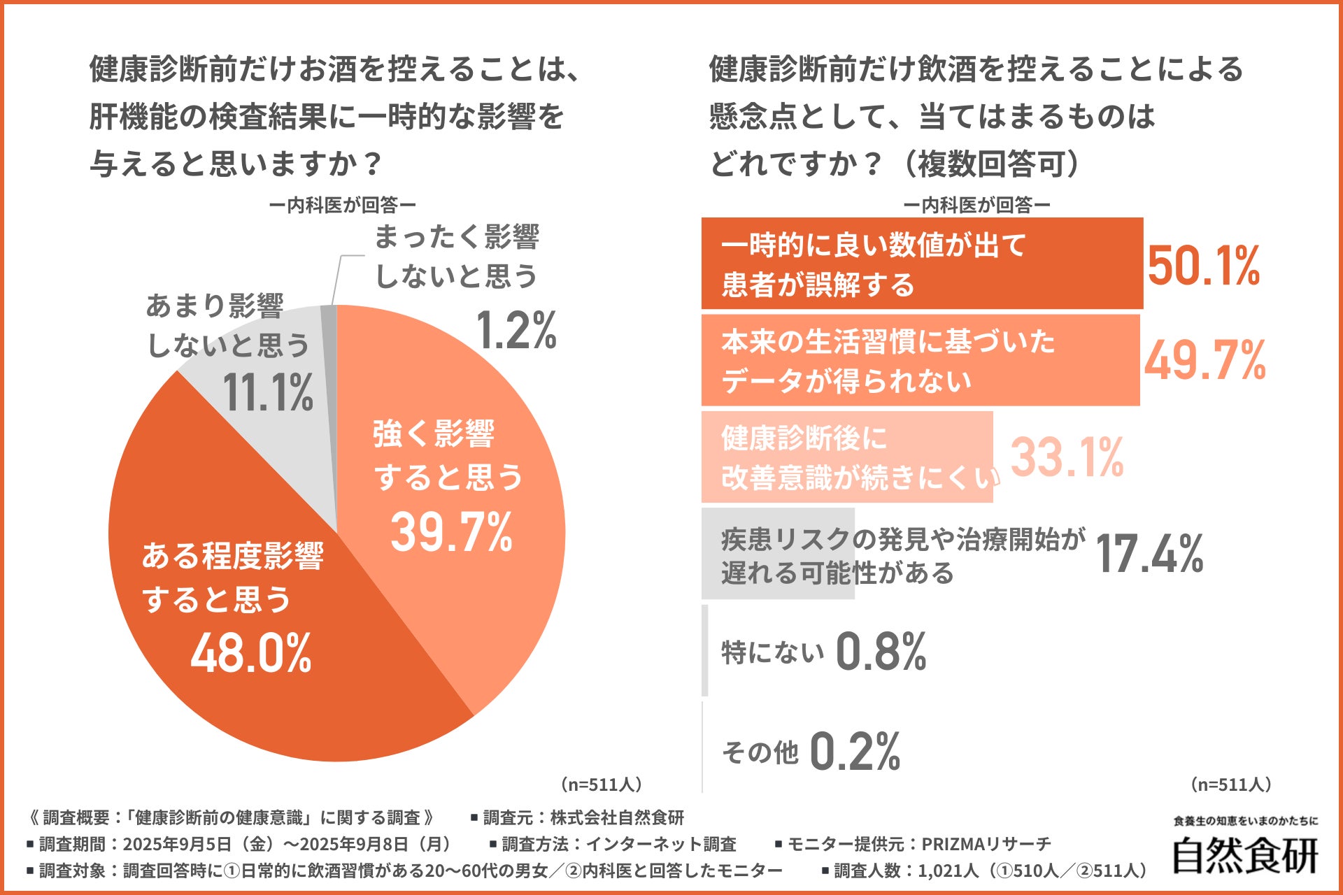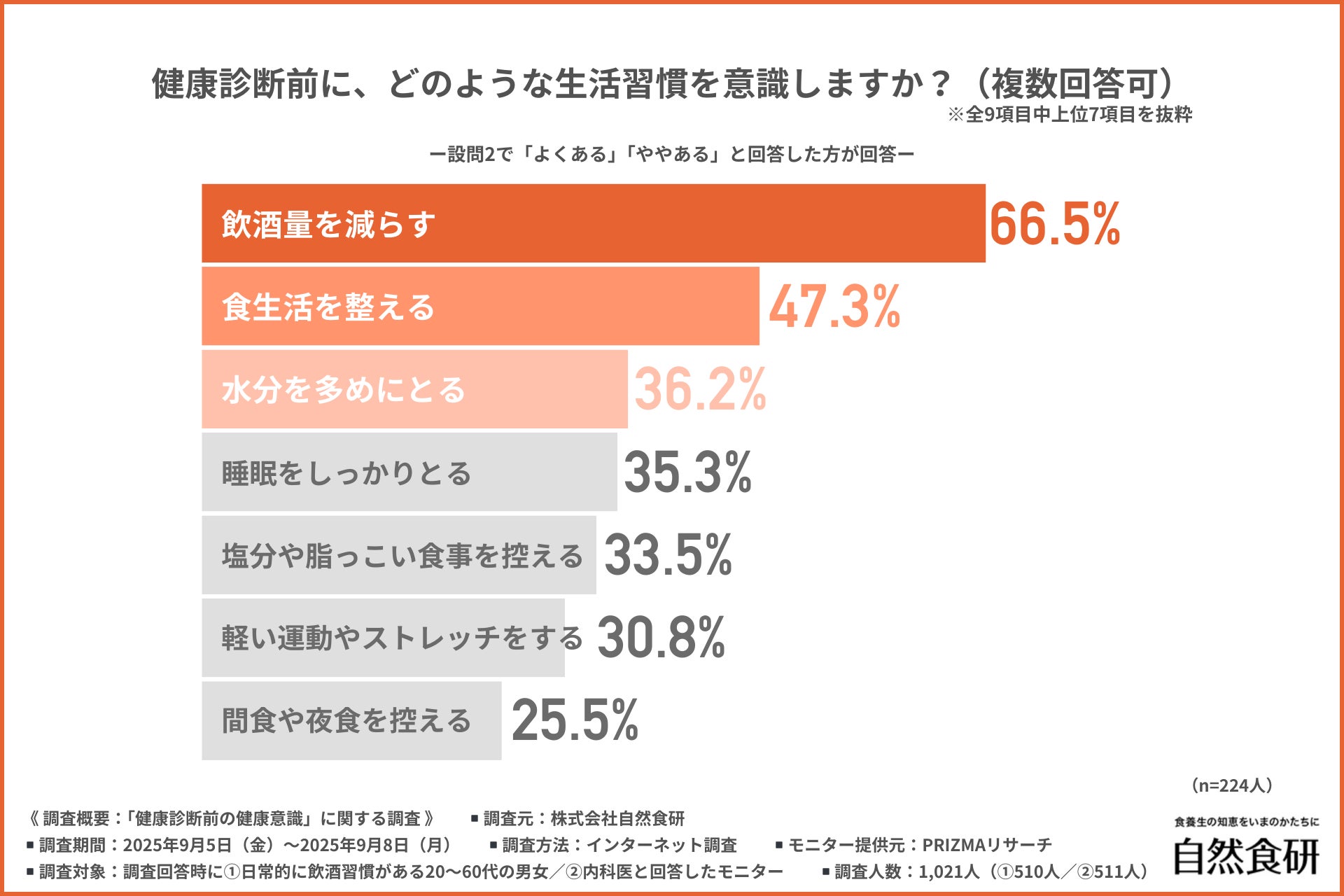 そこで今回、株式会社自然食研(https://www.sizenshokken.co.jp/)は、①日常的に飲酒習慣がある20~60代の男女/②内科医を対象に、「健康診断前の健康意識」に関する調査を行いました。