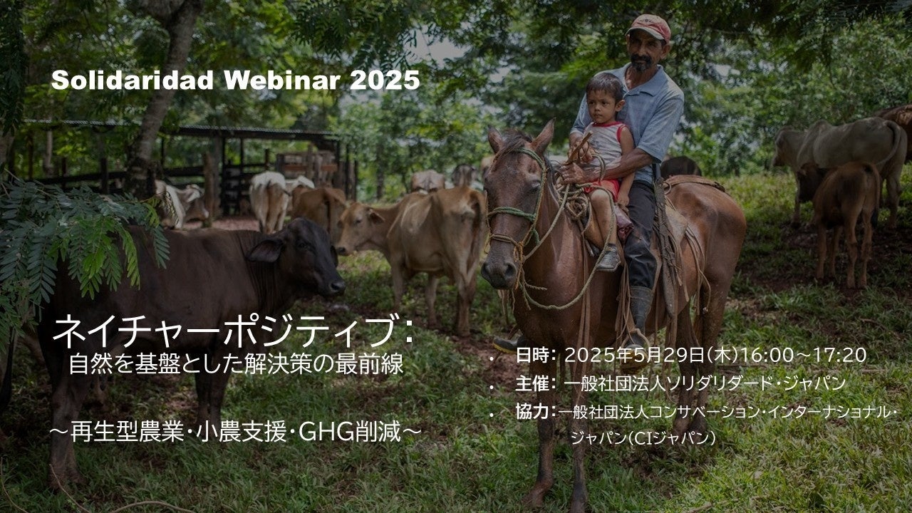 一般社団法人Solidaridad Japan(ソリダリダード・ジャパン、共同代表理事:佐藤寛)は、2025年5月29日(木)にウェビナー「ネイチャーポジティブ:自然を基盤とした解決策の最前線〜再生型農業・小農支援・GHG削減〜」を開催いたします。