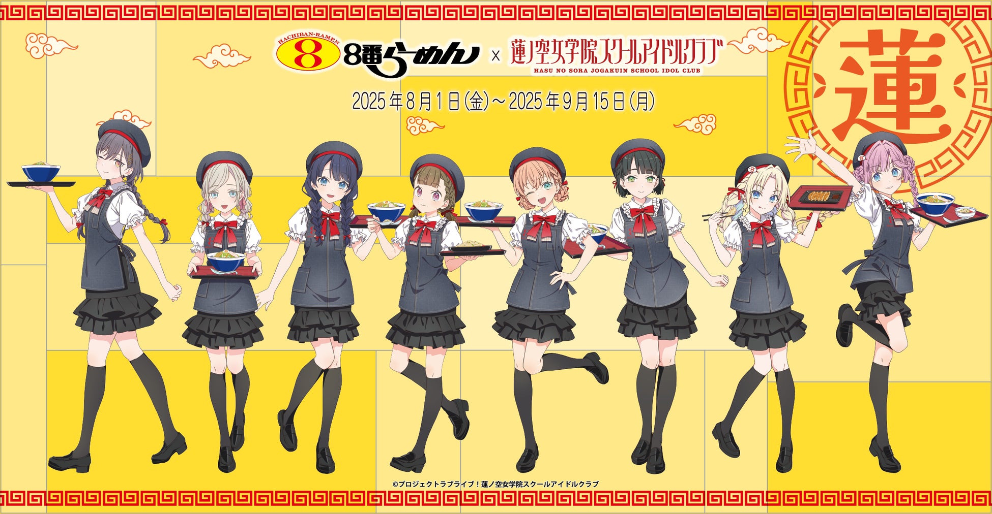 蓮ノ空メンバーが店員に!?ユニフォームをイメージした衣装を着た描き下ろしイラストグッズや、コラボメニューの販売を8/1(金)より8番らーめん全店で開始
