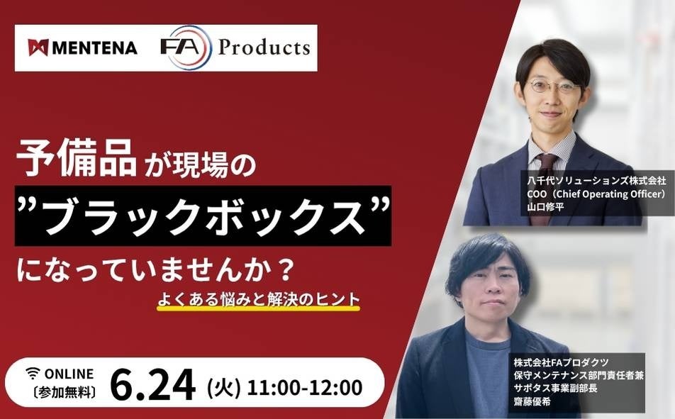 製造業向けクラウド設備管理システム「MENTENA(メンテナ)」を提供する八千代ソリューションズ株式会社(本店:東京都台東区、代表取締役社長:水野 高志)は、FA機器中古買取・販売・調達サービスを提供する株式会社FAプロダクツ(本社:東京都港区、代表取締役社長:大宮 勇樹)と共同で、製造業における予備品管理の最適化を目指す無料ウェビナーを、2025年6月24日(火)に開催します。