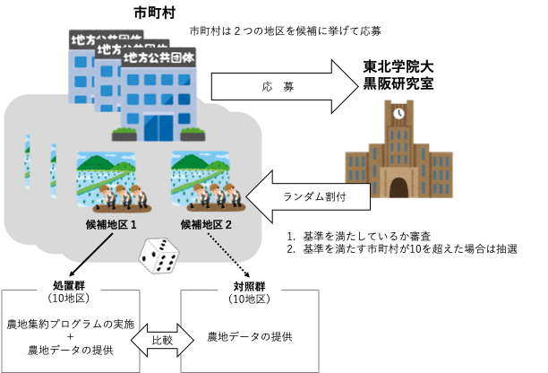市町村は2つの地区を候補として応募し、当研究室がランダムに選ぶ一方の地区で事業実施すること