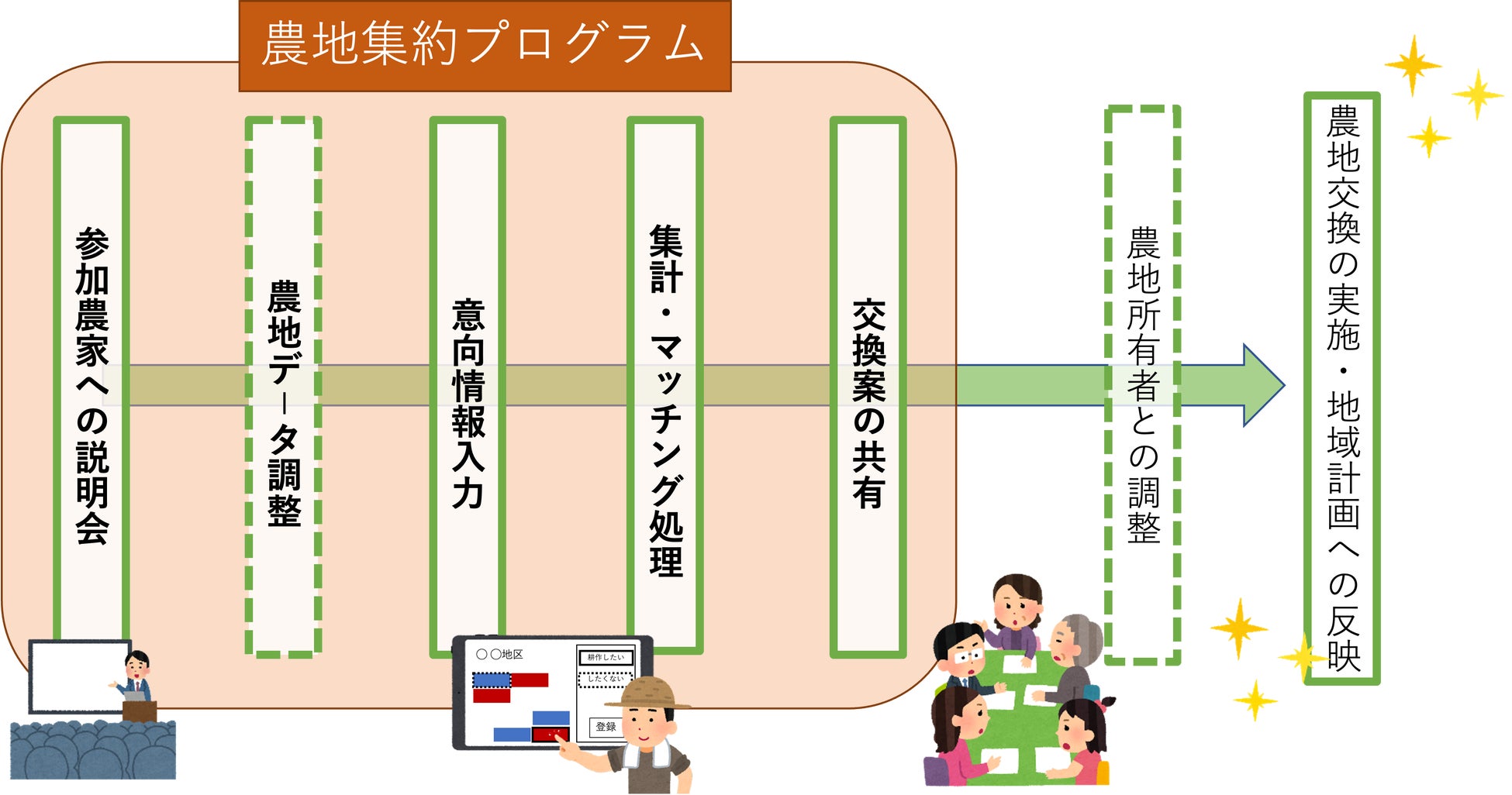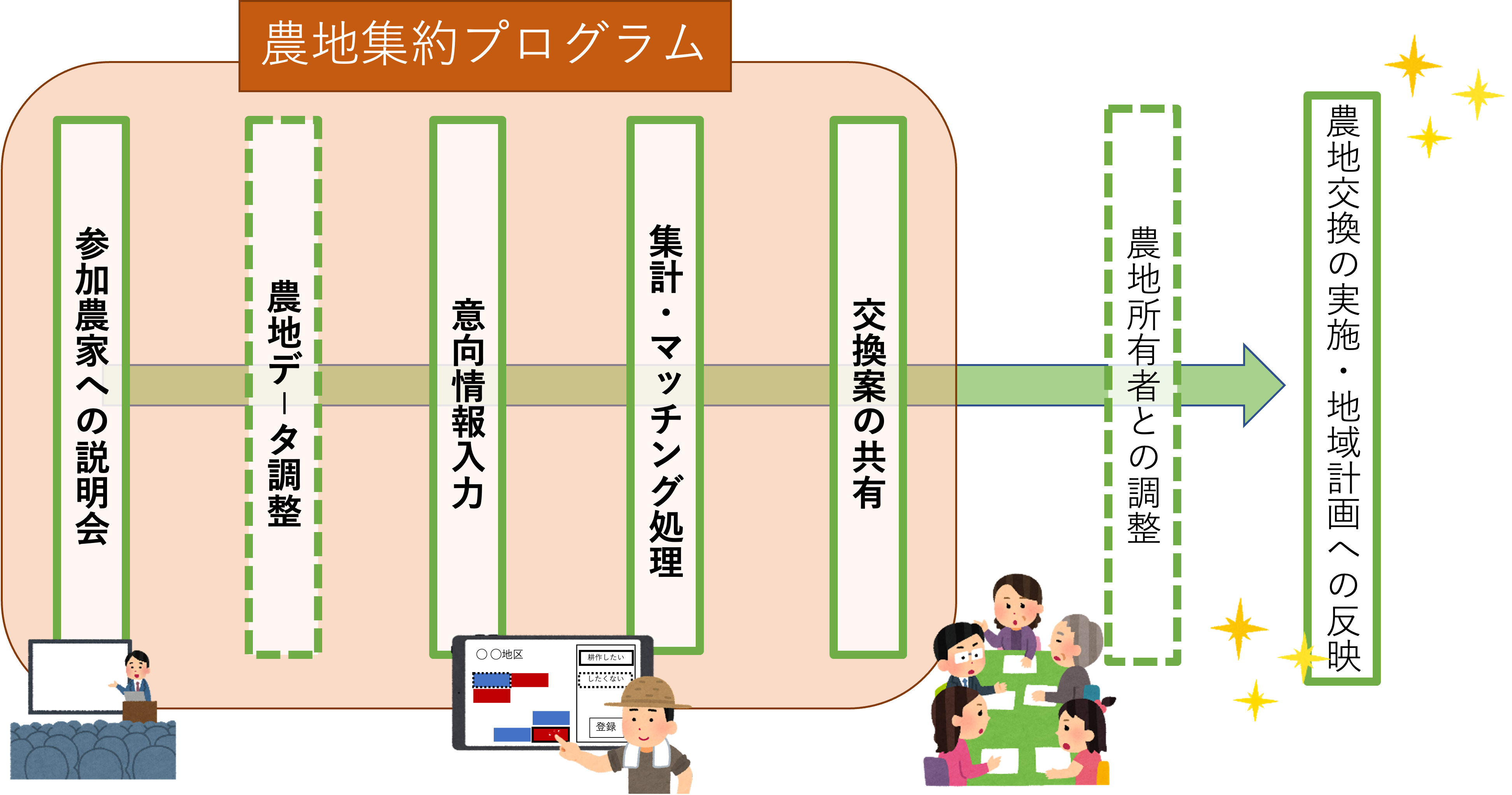 本実証事業では、農地集約プログラムが分散錯圃の解決にどの程度有効であるのか、農家の生産活動にどのような影響を与えるのかについて、全国の市町村を対象とした大規模な検証を行います。