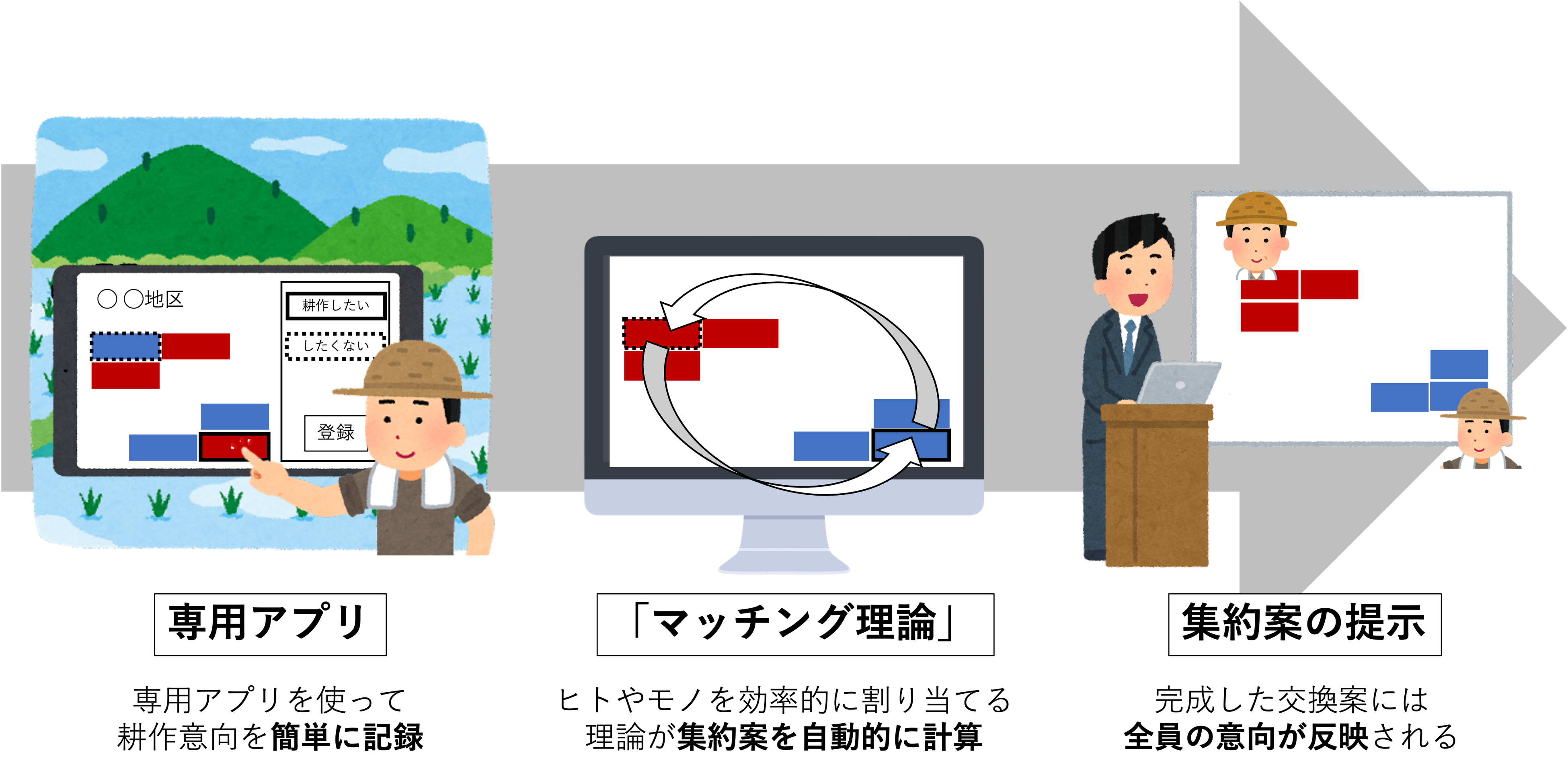 このような分散作圃の解決を目的として、東北学院大学黒阪研究室は一般社団法人Tannboと共同で、農家の耕作意向情報(「耕作したい農地」はどこか、「耕作したくない農地」はどこか)を専用Webアプリを通じて収集し、「耕作したい農地」と「耕作したくない農地」をマッチングさせる農地集約システムの開発を進めてきました。(「農地集約システム」特許第7765096号)