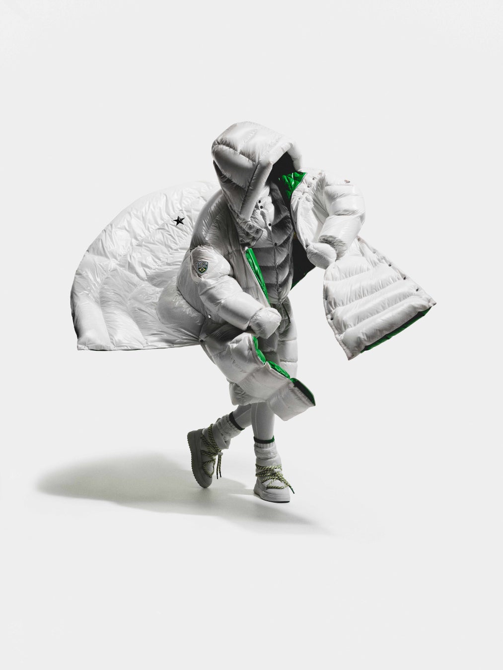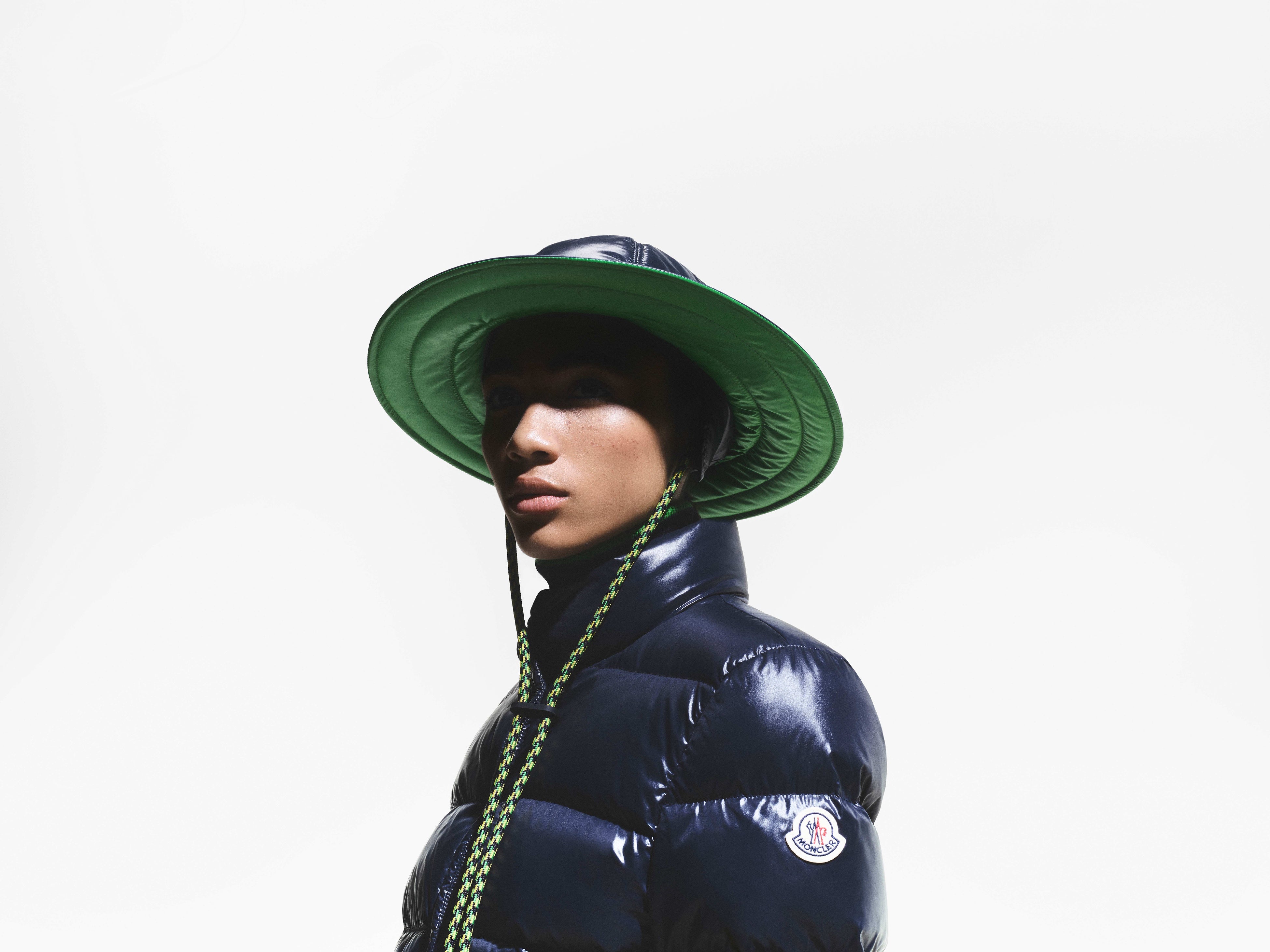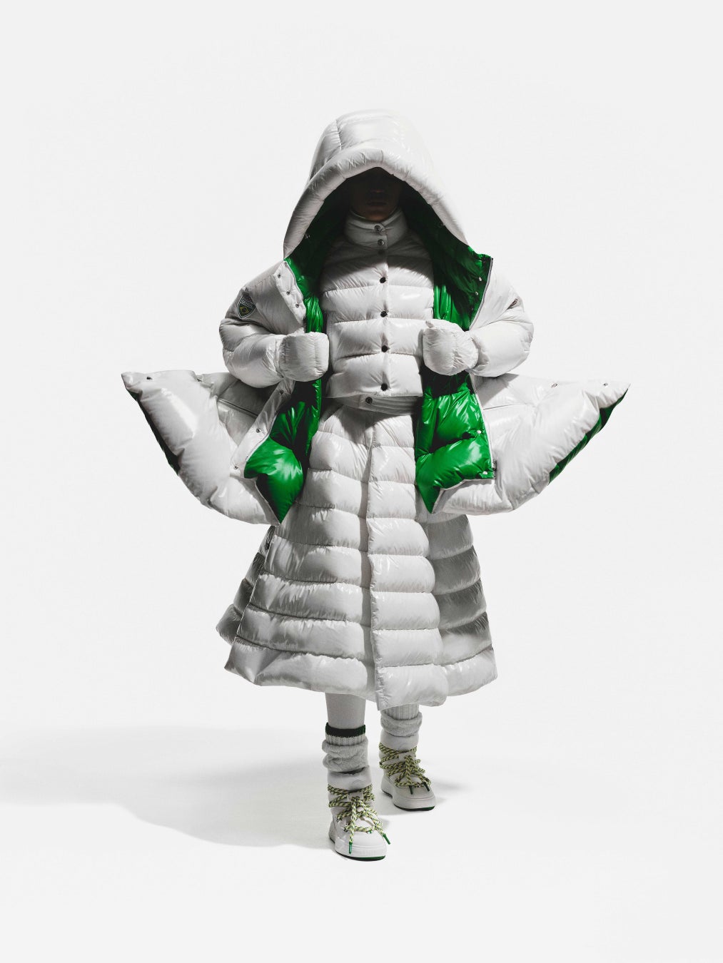 ブルーのルックには、シグネチャーであるパファージャケットを採用し、男性はショーツ、女性はスカートを合わせています。フットウェアには、モンクレール アルティブ ウィンターブーツを採用し、特別仕様のホワイトとブルーのカラーで再解釈しています。