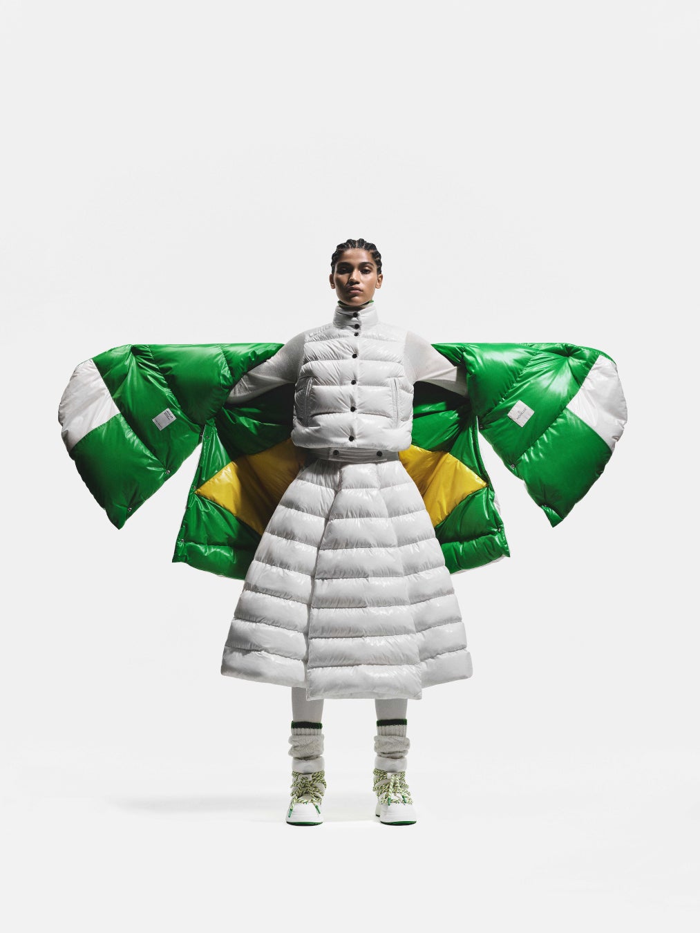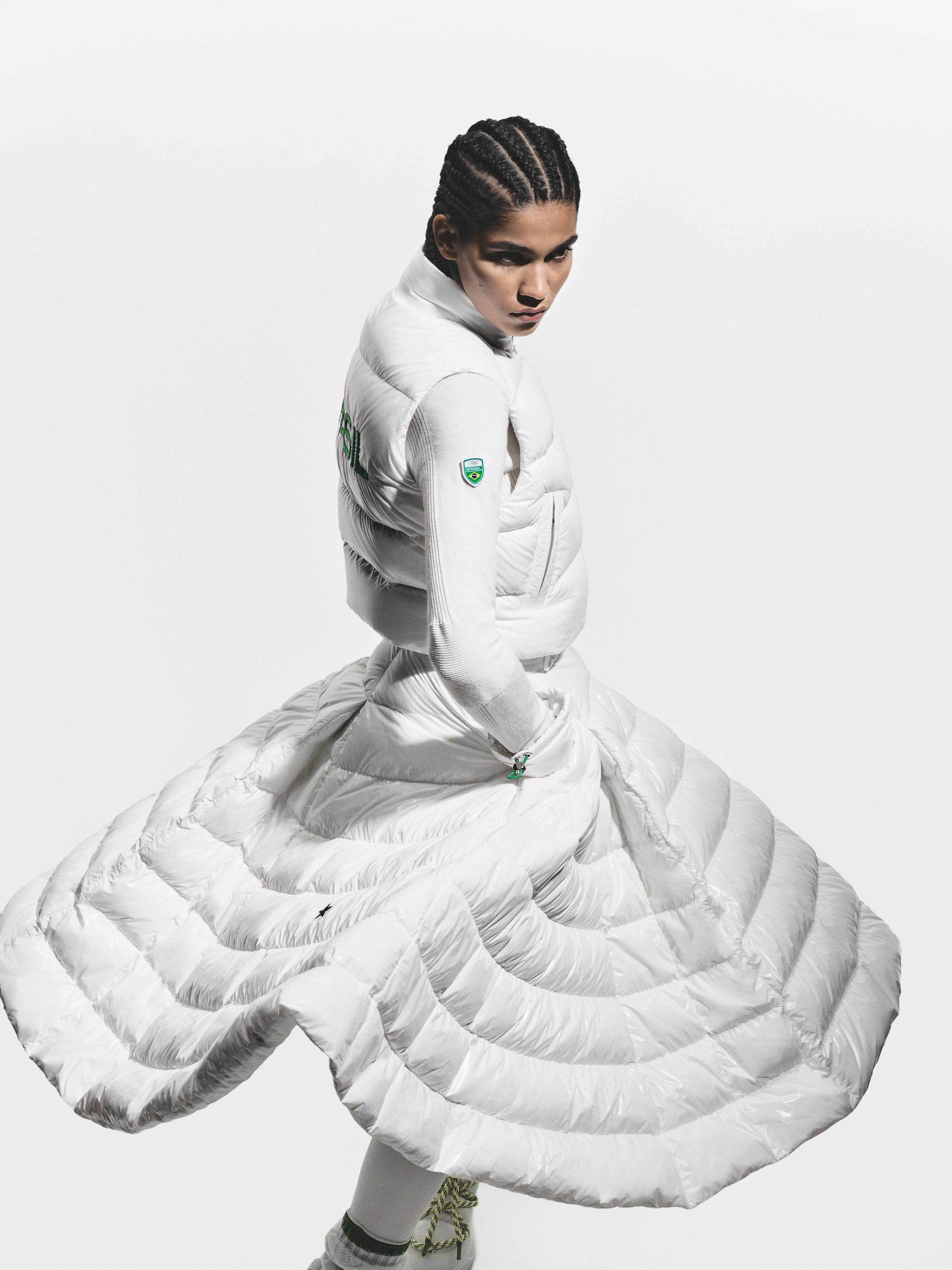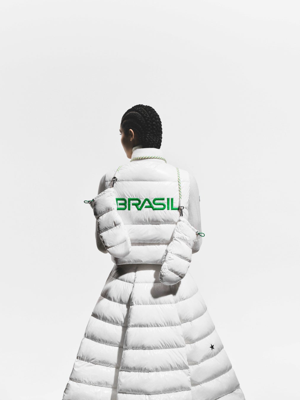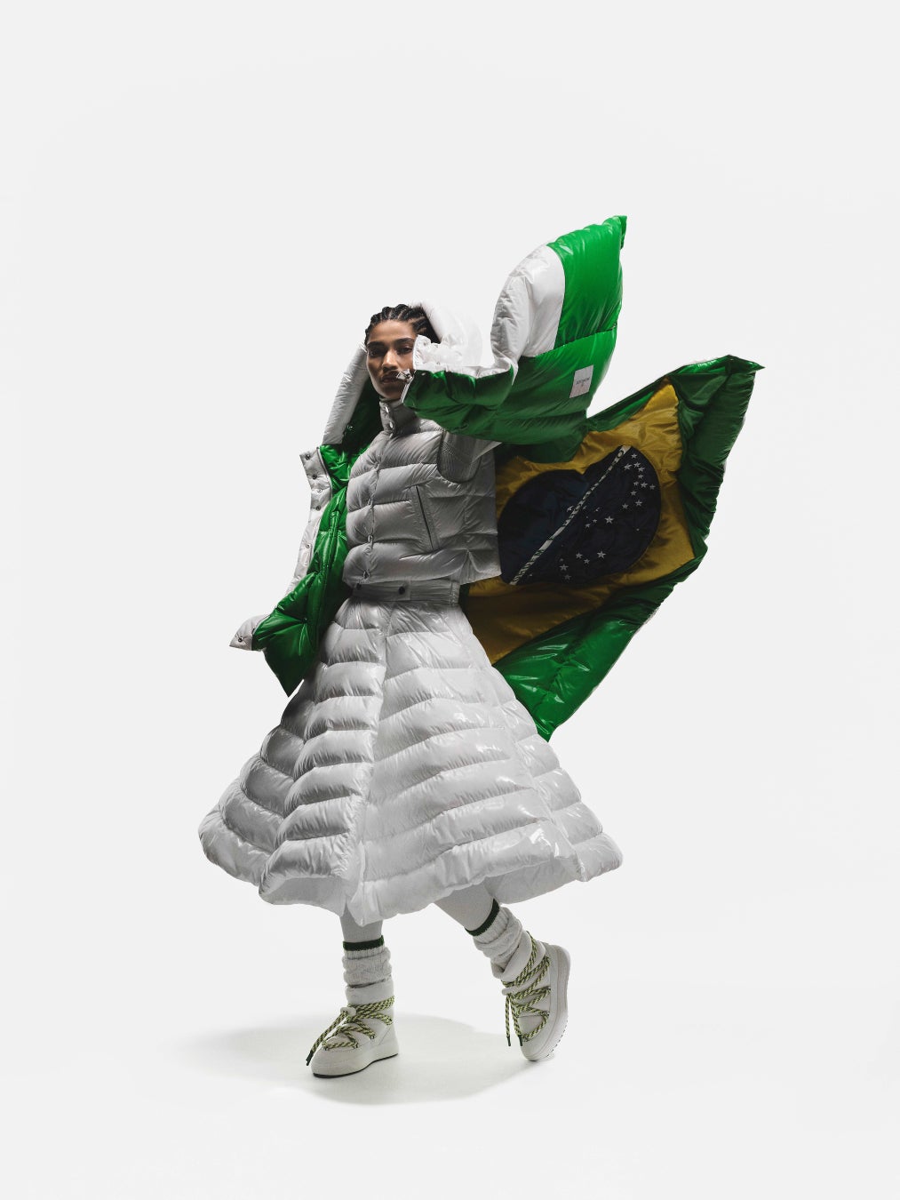 各ケープの内側には、インターシャによってブラジル国旗が織り込まれており、コルティナで行進するニコル、そしてミラノで行進するルーカスの動きに呼応して、その内側から国旗がさりげなく姿を現します。本デザインは、モンクレールのシグネチャーであるリサイクルナイロンラケを使用し、卓越した機能性とセレモニアルな存在感を兼ね備えています。