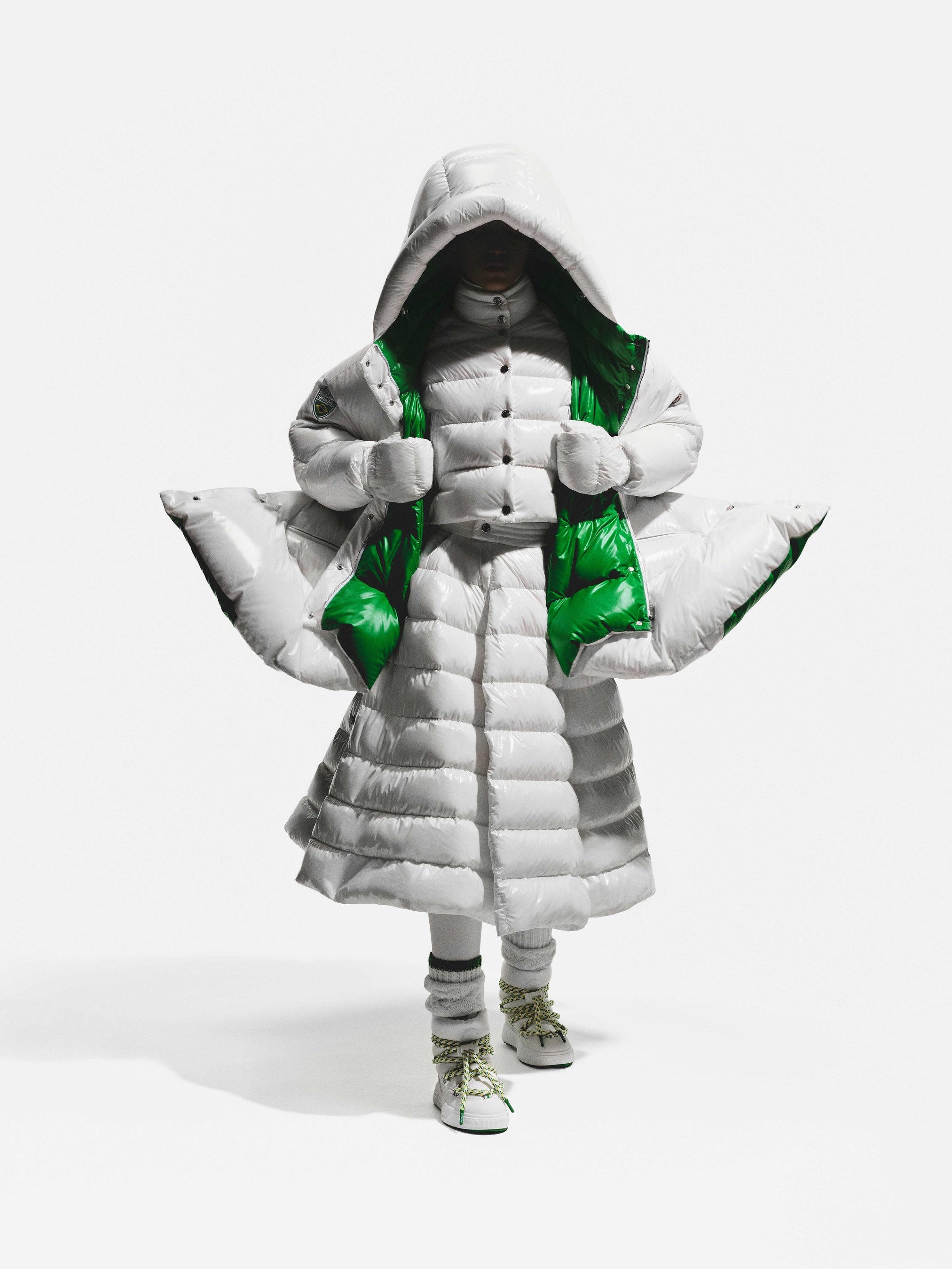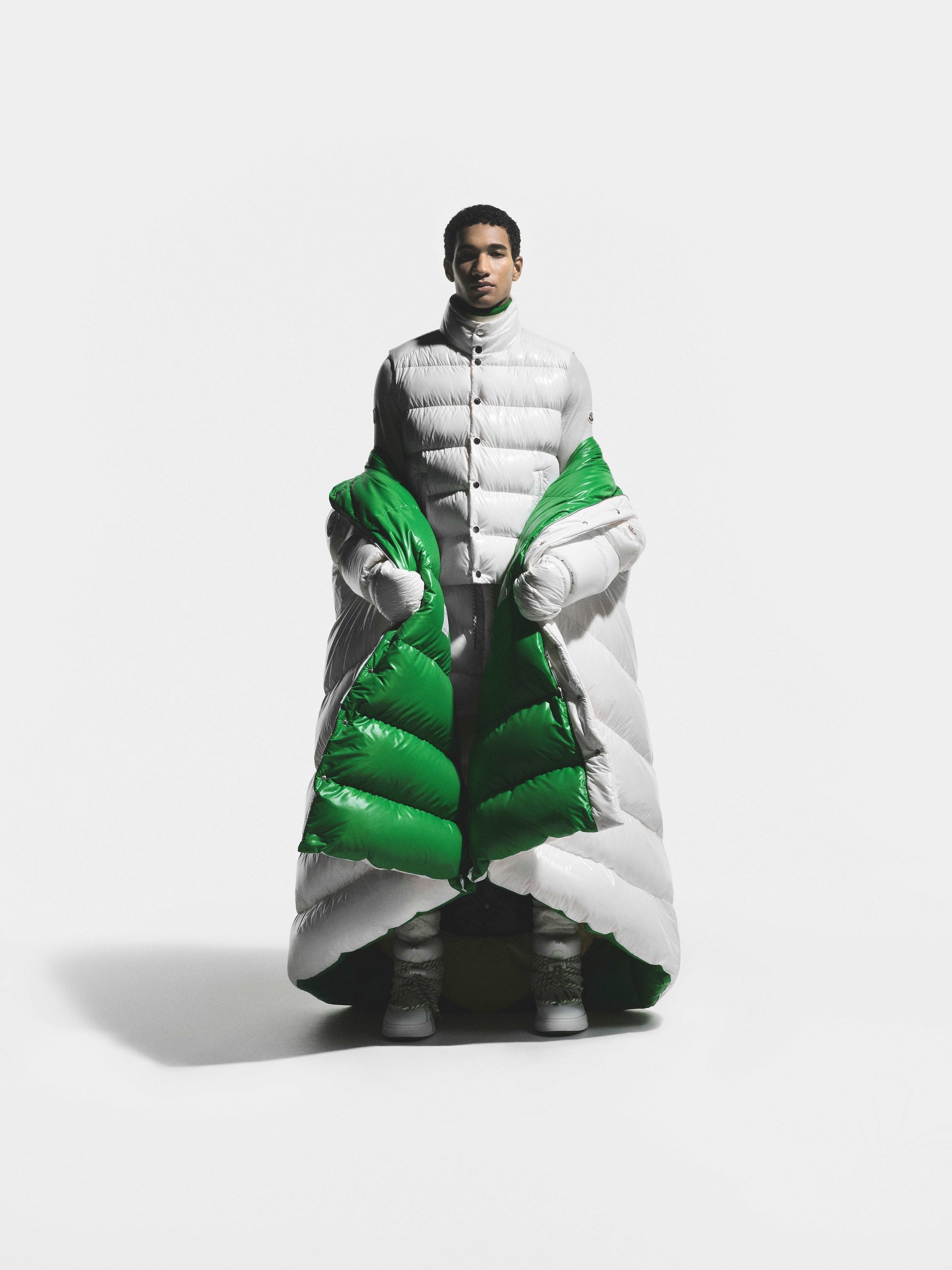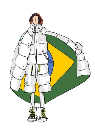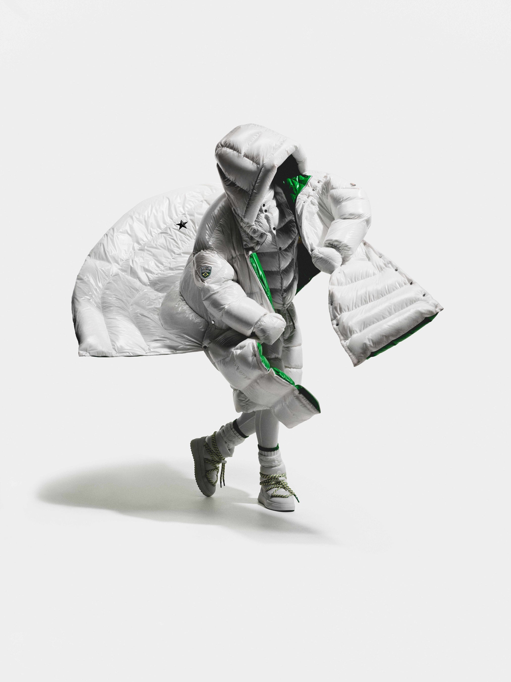 各ケープの内側には、インターシャによってブラジル国旗が織り込まれており、コルティナで行進するニコル、そしてミラノで行進するルーカスの動きに呼応して、その内側から国旗がさりげなく姿を現します。本デザインは、モンクレールのシグネチャーであるリサイクルナイロンラケを使用し、卓越した機能性とセレモニアルな存在感を兼ね備えています。