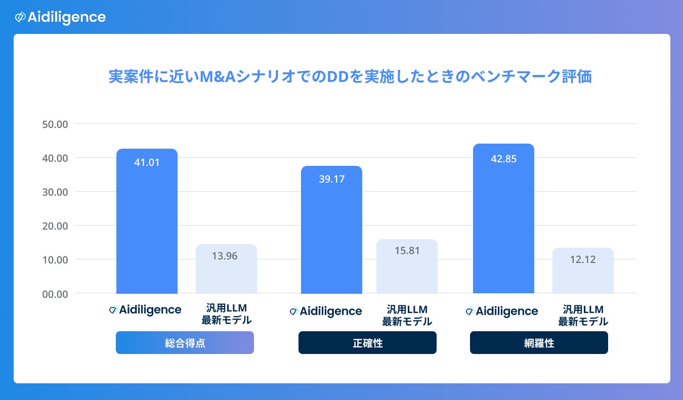実際のM&Aを想定した架空の企業に対して、実際の専門家が法務・労務に関するDDとして指摘される調査事項を正解とし、対象企業のファイル群を与えた上でAidiligenceと汎用LLMの最新モデルAPIの出力を以下の評価軸にて採点を行いました。