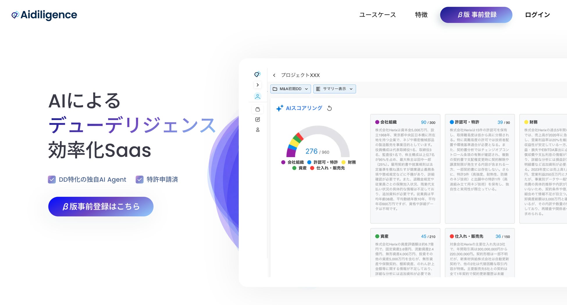 AidiligenceはM&Aなどの事業投資における買手側の案件開始時の検討フェーズでのDDや、会計事務所・法律事務所が行う財務・法務・労務等の専門的なDDへの活用を目指しており、本独自エージェントを組み込んだAidiligenceのβ版を順次ご案内しています。