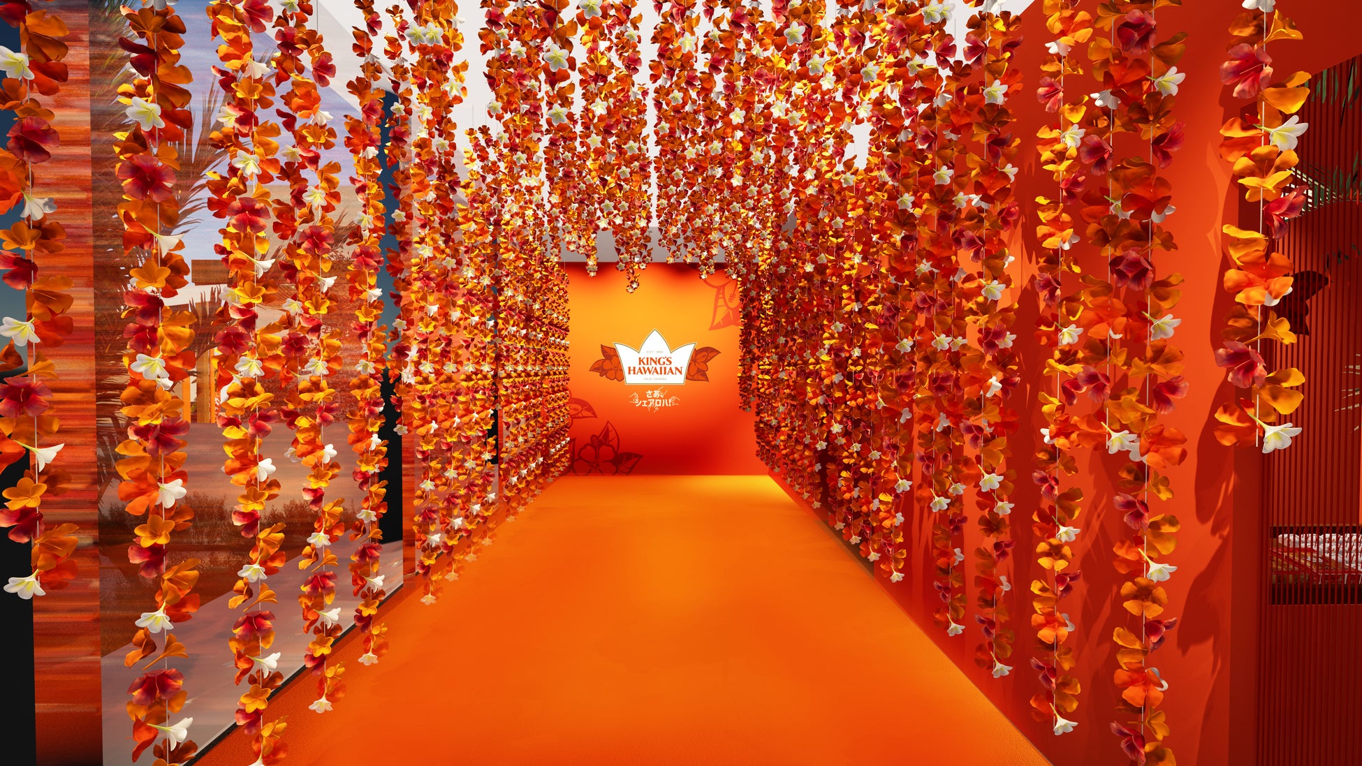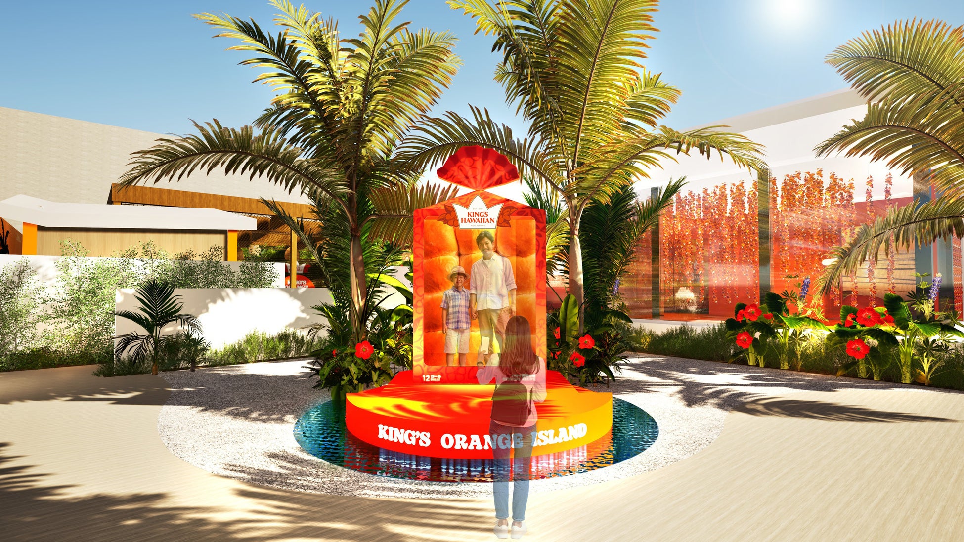 「KING’S HAWAIIAN」の日本本格上陸を記念したPOP UP「KING’S ORANGE ISLAND」では、ブランドの世界観を五感で堪能できます。表参道に突如出現したオレンジ色と南国の植物に包み込まれた島。会場に一歩足を踏み入れると、まるで南の島に瞬間移動したかのような特別な空間を体験できます。