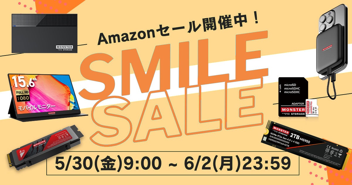 Amazon で5月30日(金)9:00から6月2日(月)23:59 にかけて開催される「Amazon スマイルSALE」にMonster Storage製品がお得なセール価格で登場します。