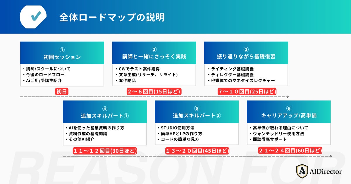 AI Directorでは、初回セッションから案件獲得、さらにキャリアアップまで体系的に学べる充実したカリキュラムを提供しています。
