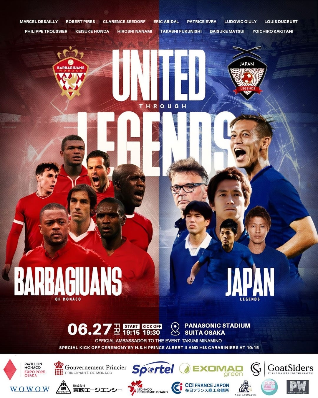 「United through Legends」は、モナコの非営利団体であるBARBAGIUANS OF MONACO が主催するもので、モナコナショナルデー(6月28日)の前夜祭として開催されます。当日はモナコのレジェンドチーム「Monaco Legends (Barbagiuans of Monaco)」と、日本サッカー界のレジェンド「Japan Legends」が対戦。各国の元代表選手が出場を表明しています。なお、イベントの収益は令和6年(2024年)能登半島地震の被災地支援のほか、日・モナコ両国の慈善団体へ寄付します。