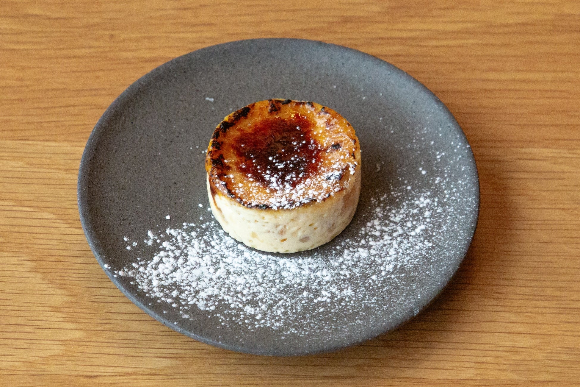 デザートには、福島県オリジナルの「FGAP認証」を取得した会津若松市・しらい農園の白井さんが育てるりんごを使ったクレームブリュレをご用意しました。コンポートにしたりんごをブリュレ生地に混ぜ込み、オーブンで焼き上げた後に冷やし、仕上げにバーナーでカラメリゼして提供します。