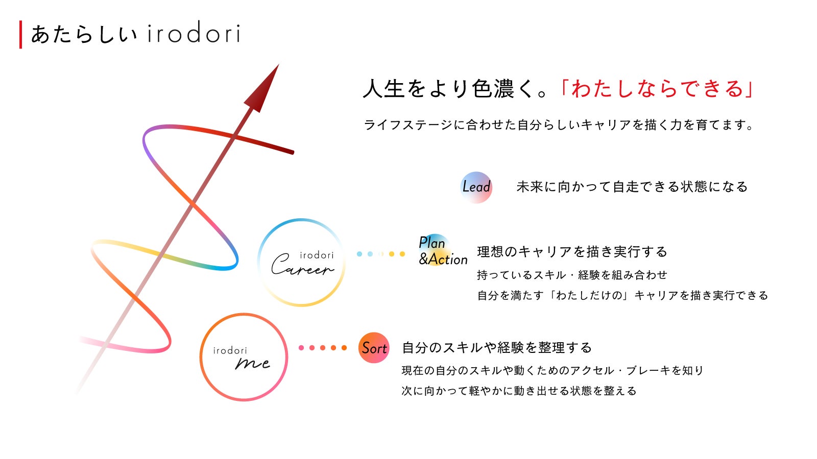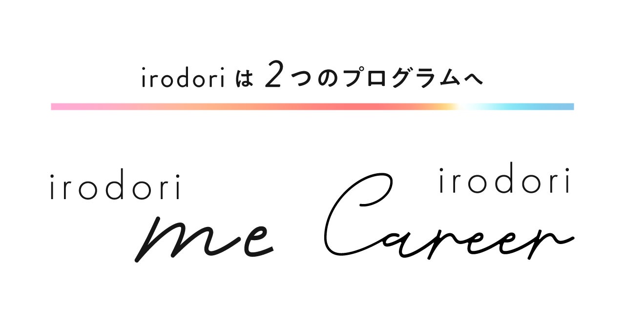 リスキリングが注目される昨今、スキルを学んでも、次の一歩が見えない。そんなキャリア迷子状態に悩む女性の声を受けて、本リニューアルでは、自己理解で土台をつくる「irodori Me」と、自分のスキルを組み合わせ自分を満たす仕事をつくる「irodori Career」、2つのプログラムに分け刷新いたします。
