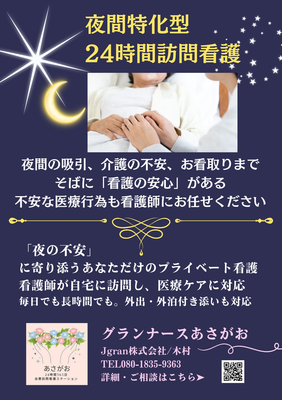 【グランナースあさがお】「夜間の介護に家族が疲弊」そんな現場の声から誕生。夜間特化・24時間の新しい訪問看護。在宅介護の夜に安心を届ける、初回体験プランを7.8月限定でご案内。