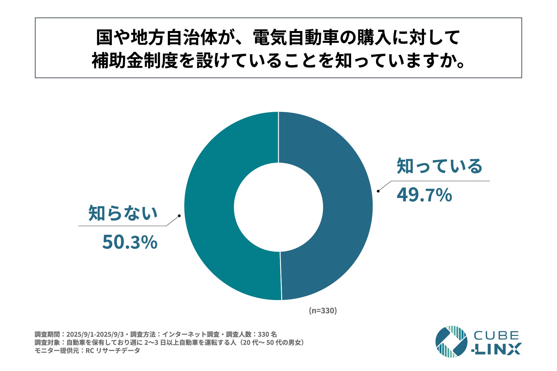 週に2〜3日以上自家用車を運転する人の半数以上が、国や地方自治体が、電気自動車の購入に対して補助金制度を設けていることを知らない!株式会社CUBE-LINXが「電気自動車に関する意識調査」を実施!