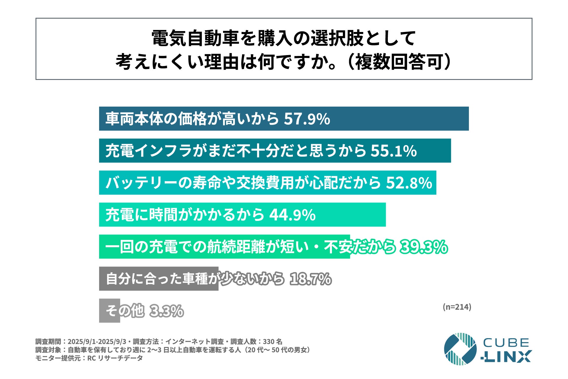 調査の最後、新たに自動車を購入する想定した場合、電気自動車はあまり選択肢に入らない、またはまったく選択肢には入らないと回答した人を対象に「電気自動車を購入の選択肢として考えにくい理由」を尋ねる設問への回答では、1位が「車両本体の価格が高いから」で57.9%、2位が「充電インフラがまだ不十分だと思うから」で55.1%、3位が「バッテリーの寿命や交換費用が心配だから」で52.8%という結果になりました。この結果から、今後新たに自動車を購入する場合、電気自動車はあまり選択肢に入らない、またはまったく選択肢には入らない方が、電気自動車を購入の選択肢として考えにくい理由は主に、「車両本体の価格が高いから」や「充電インフラがまだ不十分だと思うから」であることが明らかになりました。