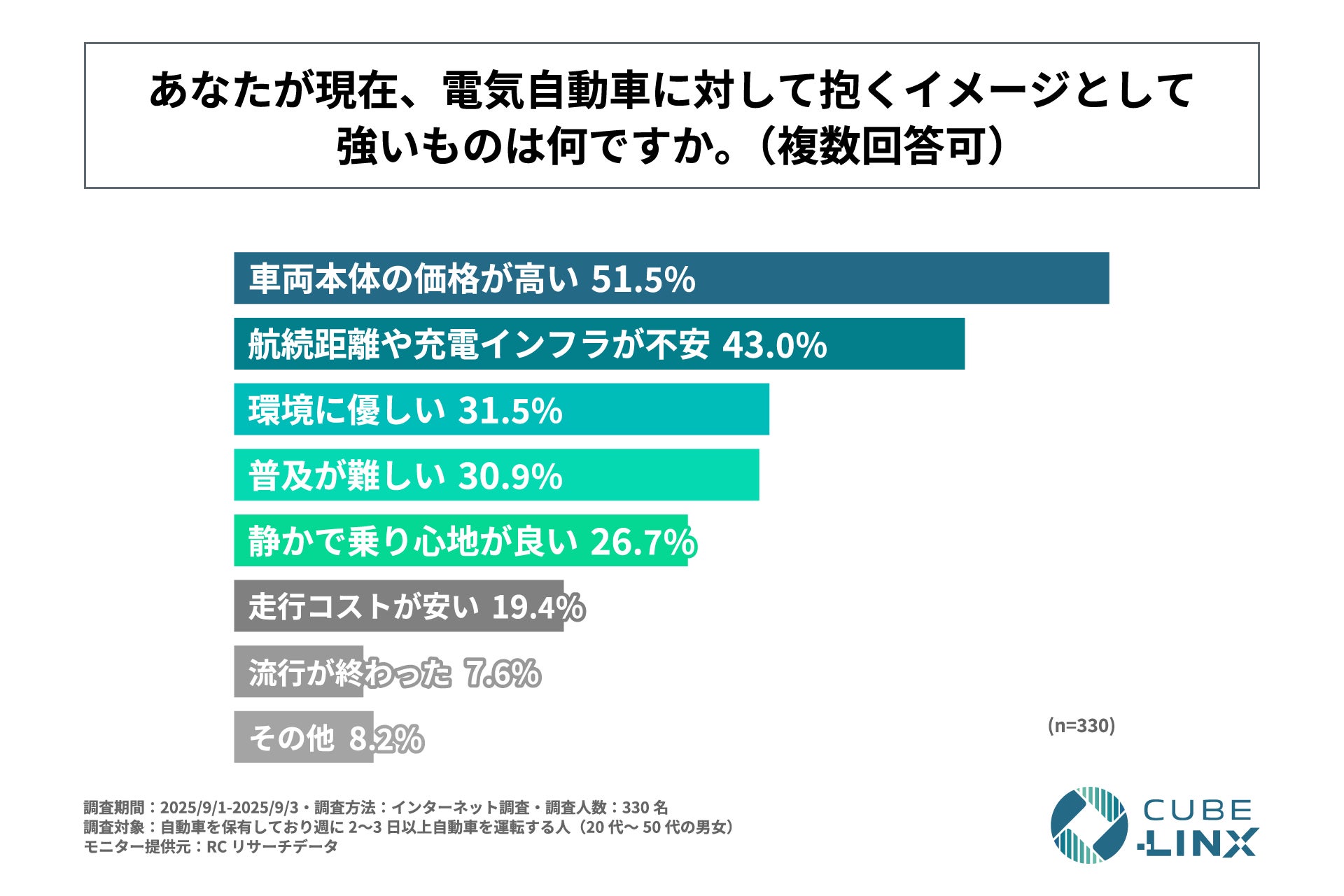 株式会社CUBE-LINX(本社:東京都日野市、代表取締役:桐明 幹)は、自動車を保有しており週に2〜3日以上自動車を運転する人(20代~50代の男女)を対象に「電気自動車に関する意識調査」を実施しました。この調査から、週に2〜3日以上自家用車を運転する人の電気自動車への関心やイメージ、電気自動車購入への意識などが明らかになりました。