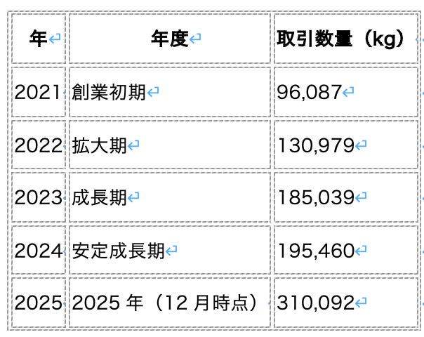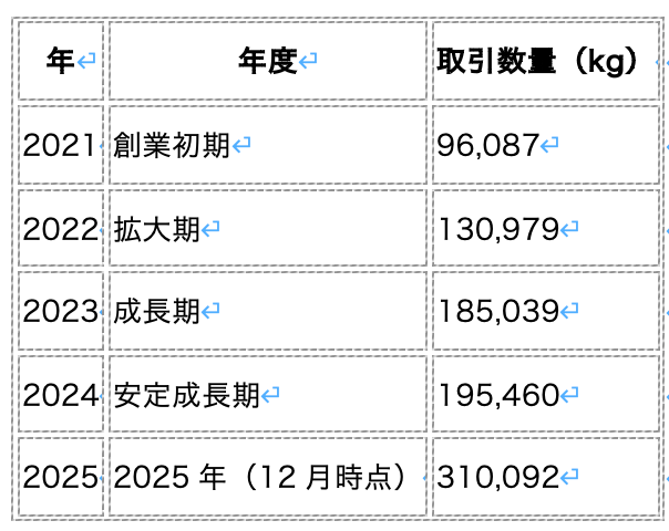買いクルチェーン内の公式データでは、同社の取引量はこの5年間で約3.2倍、取引額は買いクルチェーン発足後から13,068%に拡大。2025年の輸出数量は31万kg超(2025年12月1日現在)に達している。