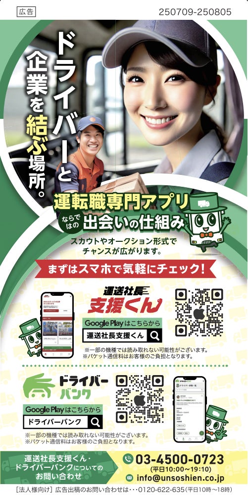 株式会社運送社長支援(本社:神奈川県横浜市、代表取締役:藤井峻)は、同社が運営する運転職特化型求人アプリ『運送社長支援くん』『ドライバーバンク』のプロモーションとして、全国のファミリーレストラン「ガスト」100店舗にてテーブルスタンド広告を2025年7月9日より展開いたします。
