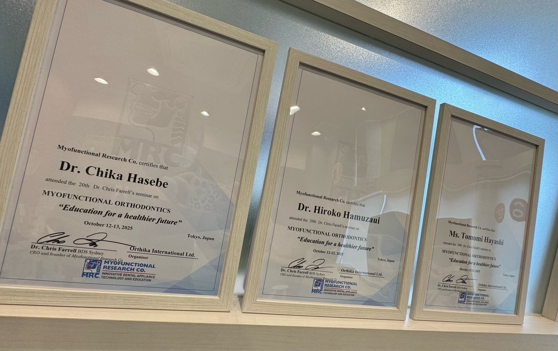 このたび当院では、2025年7月に開発された「MRCエデュケーター認定試験」において新たな合格者が誕生し、2024年合格のスタッフとともに、より多くのお子様に予防矯正プログラムを提供できるようになりました。