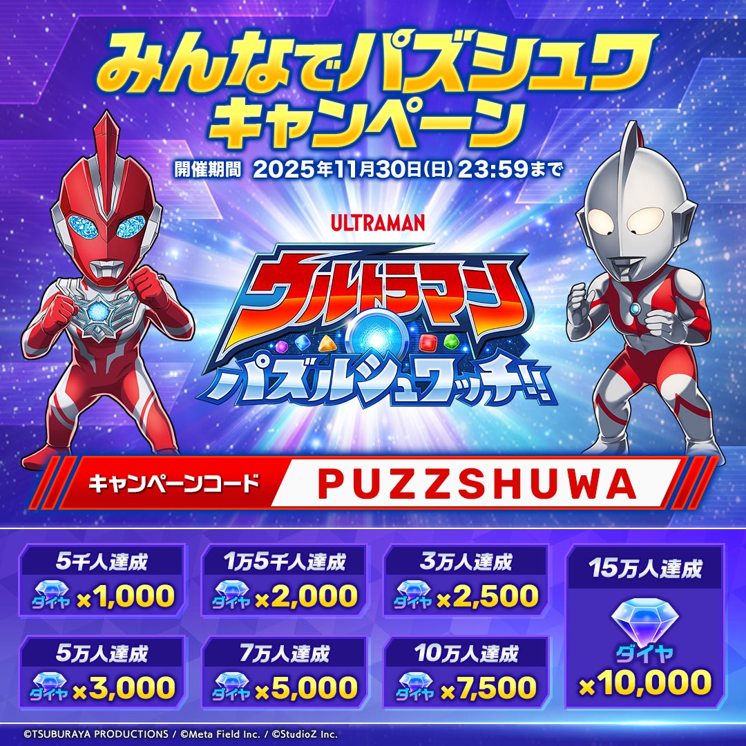 StudioZ株式会社(本社:東京都港区、代表取締役CEO:古瀬祥一、以下「StudioZ」)は、円谷フィールズホールディングスのデジタル事業戦略子会社であるメタフィールド株式会社(本社:東京都渋谷区、代表取締役社長 大塩 忠正、以下「メタフィールド」)との共同事業として、株式会社円谷プロダクション(本社:東京都渋谷区、代表取締役社長 永竹 正幸、以下「円谷プロ」)監修のもと、スマートフォン向けアプリゲーム『ウルトラマン パズルシュワッチ!!(通称:パズシュワ)』のサービスを正式に開始いたしました。