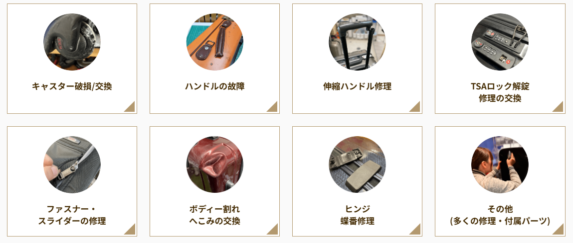 キャスター交換や軽微な故障であれば、その場で修理が完了。旅行中でも当日受け取りが可能です。 |