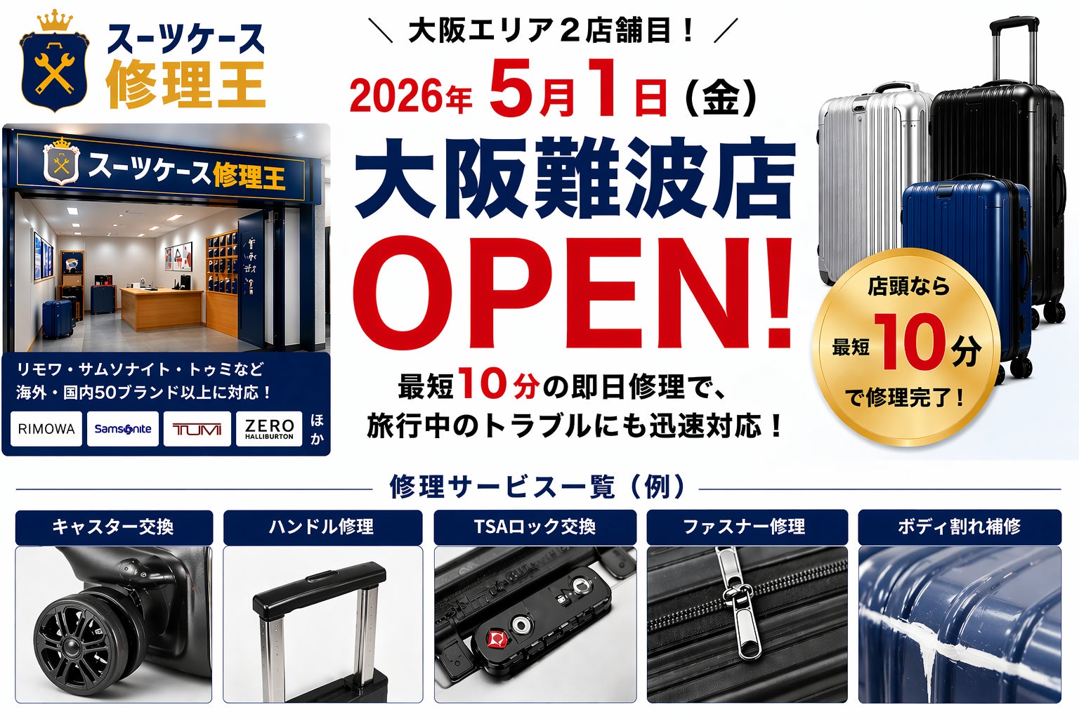 スーツケース修理王(運営:合同会社スーツケース王、本社:大阪府大阪市淀川区、代表社員:佐野麻依)は、2026年5月1日(木)に「スーツケース修理王 大阪難波店」をオープンいたします。