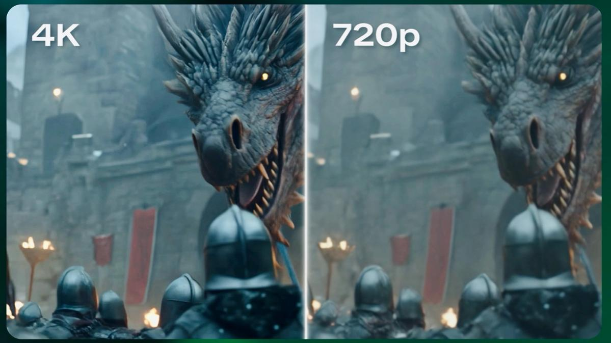 高速動態テストの映像を通じて、KlingAIが生成したネイティブ4K動画は解像度が大幅に向上し、画面のディテールがより豊かになっていることが確認できます。高速な動きや複雑な照明環境においても、ドラゴンの鱗や皮膚の質感は繊細さを崩さず、さらに遠くの建物の細部まできれいに見分けられ、映画館レベルの画質を完全に実現しています。