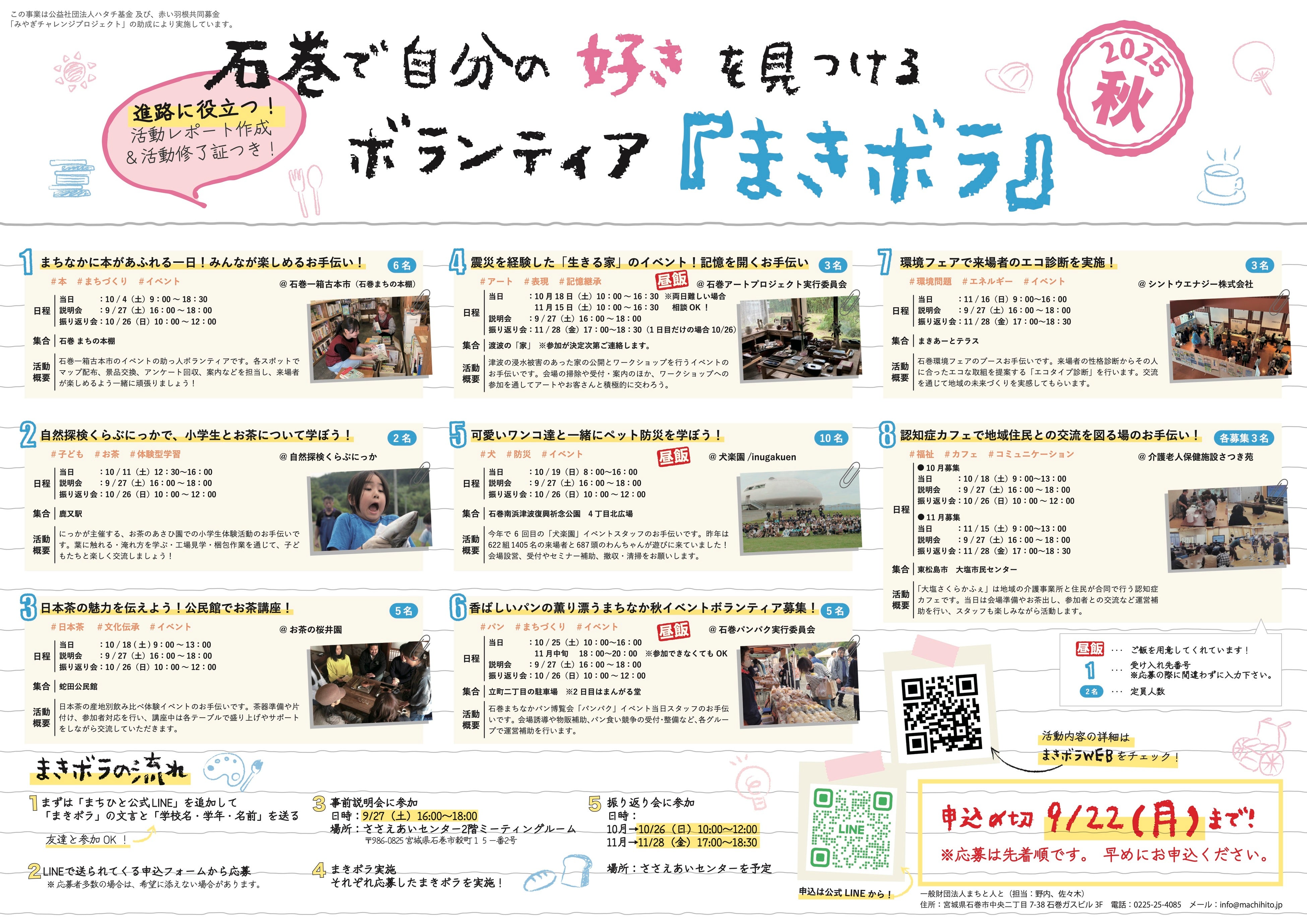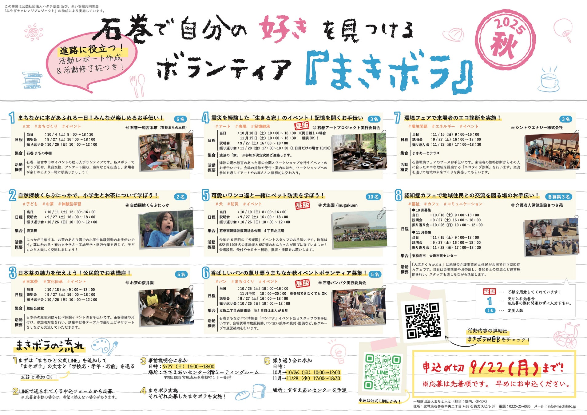[日程] ■事前説明会(学生・企業顔合わせ):9月27日(土)16:00〜18:00@ささえあいセンター(2階ミーティングルーム) ※17:00より企業との顔合わせ ■ボランティア当日:8団体 9プログラム 1.石巻一箱古本市 :10/4 (土) 9:00 ~ 18:30 2.自然探検くらぶにっか :10/11(土)12:30 〜 16:00 3.お茶の桜井園 :10/18 (土) 9:00 ~ 13:00 4.石巻アートプロジェクト実行委員会:10/18(土)10:00 ~ 16:30 11/15(土)10:00 ~ 16:30 ※2日プログラム 5.犬楽園 :10/19(日) 8:00 〜 16:00 6.石巻パンパク実行委員会 :10/25(土)10:00 〜 16:00 7.シントウエナジー株式会社 :11/16(日) 9:00 〜 16:00 8-1.介護老人保健施設さつき苑① :10/18(土) 9:00 〜 13:00 8-2.介護老人保健施設さつき苑② :11/15(土) 9:00 〜 13:00 |