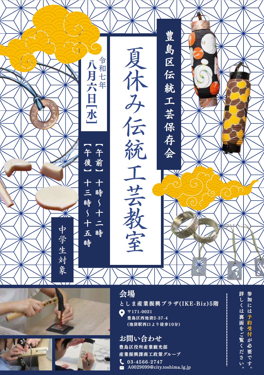 豊島区は、令和7年7月30日(水)・31日(木)、8月6日(水)に小・中学生を対象にした「夏休み伝統工芸教室」を、IKE・Bizとしま産業振興プラザ5階(豊島区西池袋2-37-4)にて開催します。