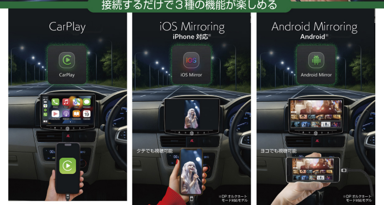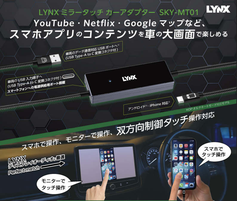 - TypeCケーブルを使用し、iPhoneとAndroid両方のミラーリングが可能