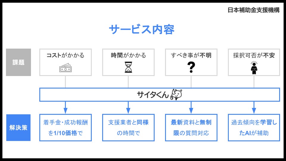 近年、補助金申請支援市場においては、過大な報酬要求や不透明な料金設定が横行しており、本来補助金を受給すべき事業者に適正な資金が届いていない状況にあります。当社代表自身が補助金申請の際に経験した不透明な料金請求や低品質なサービスといった課題を解決するため、AI技術を駆使した効率的かつ低価格な補助金支援サービスを提供し、市場全体の健全化と透明化を目指しております。