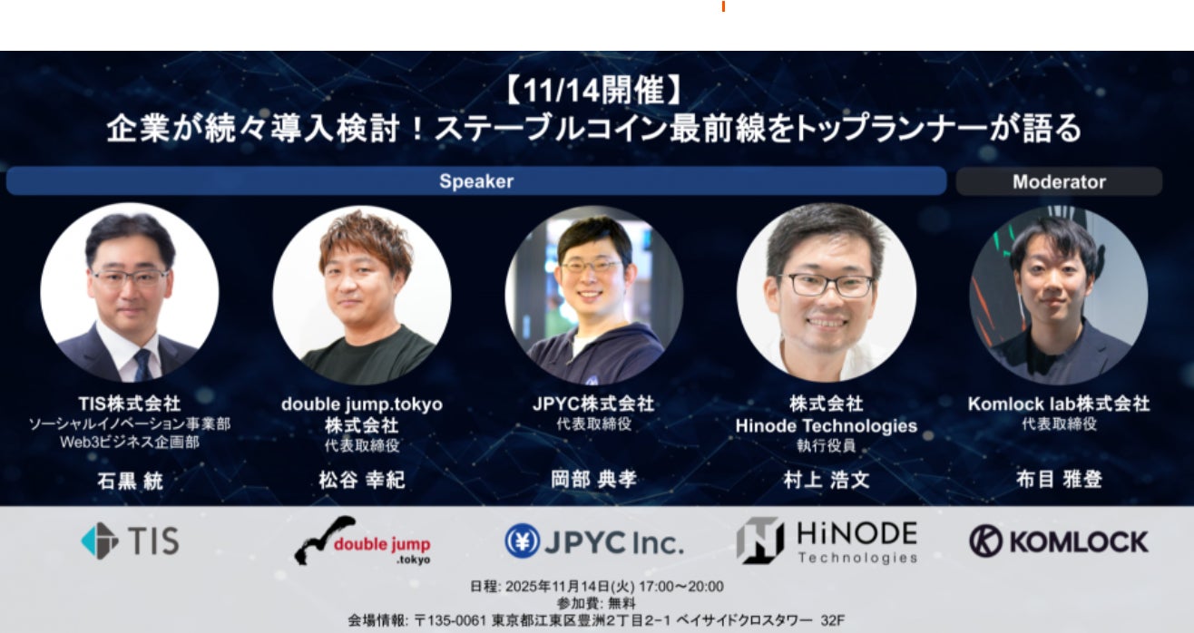 Komlock lab株式会社(所在地:東京都渋谷区、代表取締役社長:布目雅登、以下「Komlock lab」)は、TISインテックグループのTIS株式会社( 所在地:東京都新宿区、代表取締役社長:岡本安史、以下「TIS」)とdouble jump.tokyo株式会社(所在地:東京都新宿区、代表取締役:上野広伸・松谷幸紀、以下「double jump.tokyo」)が共同で開催するステーブルコイン活用をテーマにしたイベントのモデレーターとして登壇します。