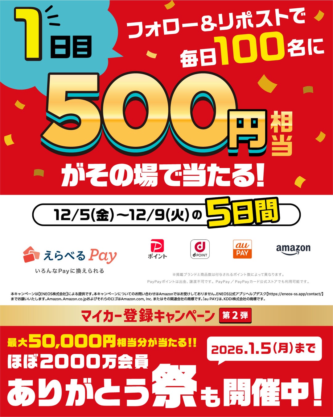 「ENEOS公式アプリ ほぼ2000万会員 ありがとう祭」の開催を記念して、ENEOS公式アプリの公式Xでは、フォロー&リポストキャンペーンを実施いたします。ENEOS公式アプリの公式Xをフォローし、対象ポストをリポストすることで、賞品がその場で当たります。本SNSキャンペーンでは、2025年12月5日(金)~12月9日(火)の5日間、毎日100名様に500円相当*²のえらべるPayを進呈いたします。ぜひ、ご参加ください。