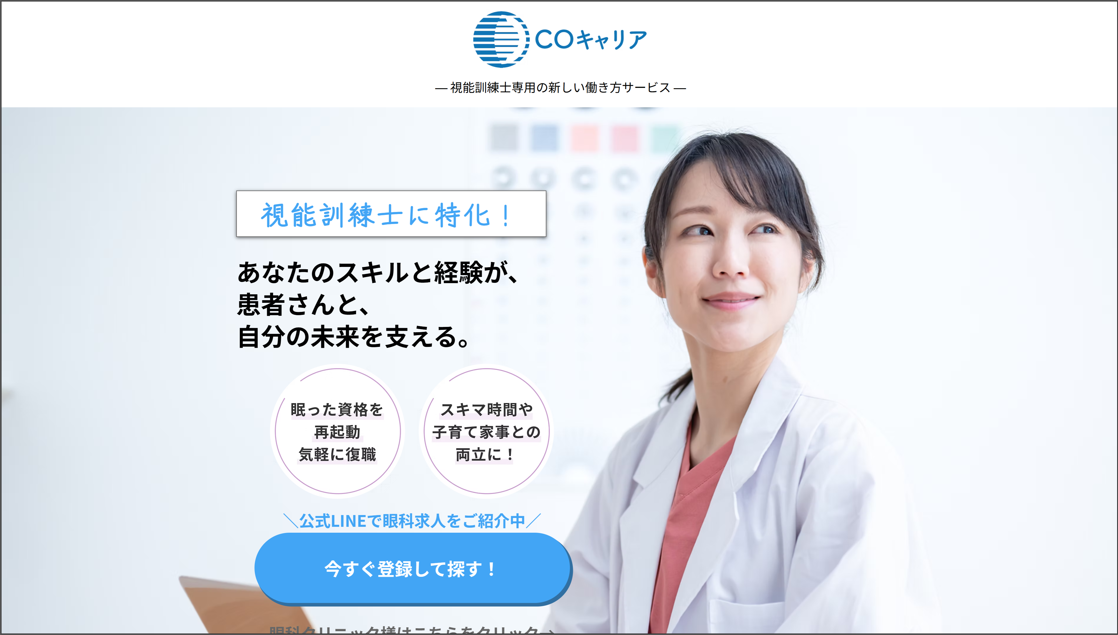 “眠っている資格”を、もう一度、医療の力に。現在、資格を持ちながら現場を離れている視能訓練士は少なくありません。COキャリアは、まずは短時間から、週1日から、“合う職場”を探すところから、無理なく復帰できる入口をつくります。眠っている資格を、もう一度、医療の現場へ。それがCOキャリアの使命です。